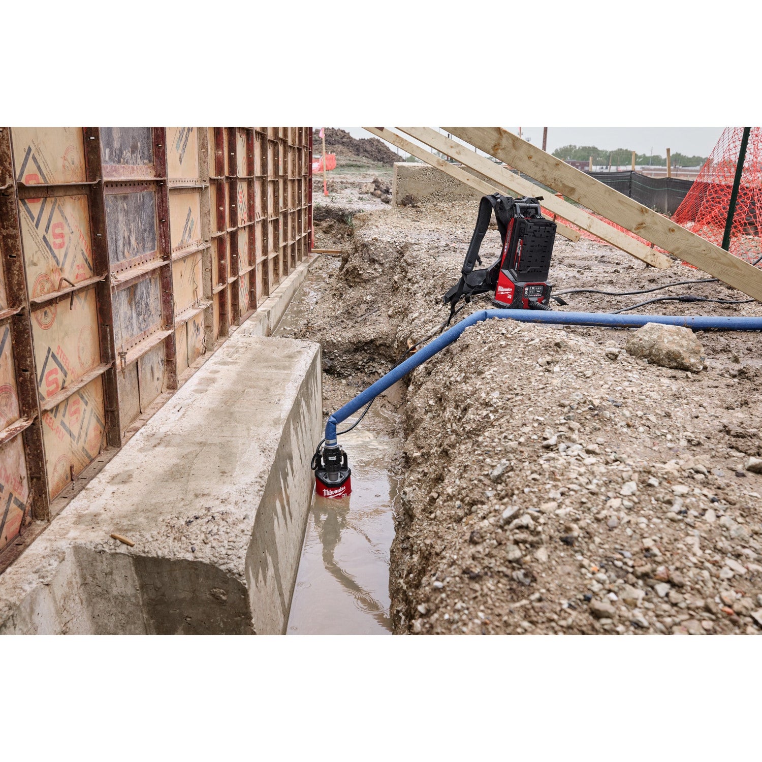 Our MX FUEL™ 1HP 2” Submersible Pump provides the portability to pump anywhere by eliminating the need to chase power and work safer with zero emissions in vaults, manholes, trenches, and other confined spaces without a generator. Milwaukee’s Submersible Pump offers users three pumping modes (Auto, High, & Low) providing the ability to select the performance needed. Utilizing Auto-Mode, the pump automatically detects the water level, shutting the POWERSTATE™ Brushless Motor off with two inches of water remaining. The pump adjusts performance over time to match changing flow and optimizes run-time. Auto-Mode saves you time and protects the pump from running dry. The Submersible Pump includes a wireless remote that notifies you of the status, reducing the need to supervise the pump. REDLINK PLUS™ Intelligence ensures optimal performance and provides overload protection to protect your machine and battery during the toughest applications. With the MX FUEL™ XC8.0 FORGE™ battery, the MX FUEL™ Submersible Pump delivers between 27 minutes (High Mode) and 110 minutes of run-time on Low Mode. On Auto-Mode, users can expect a minimum of 40 minutes of run-time and 2,800 gallons per charge as the pump optimizes run-time and flow rate. The Portable Pump Power Base is ONE-KEY™ Compatible. You can track, manage, and secure equipment from your mobile device or computer. The Submersible Pump is compatible with all MX FUEL™ batteries.