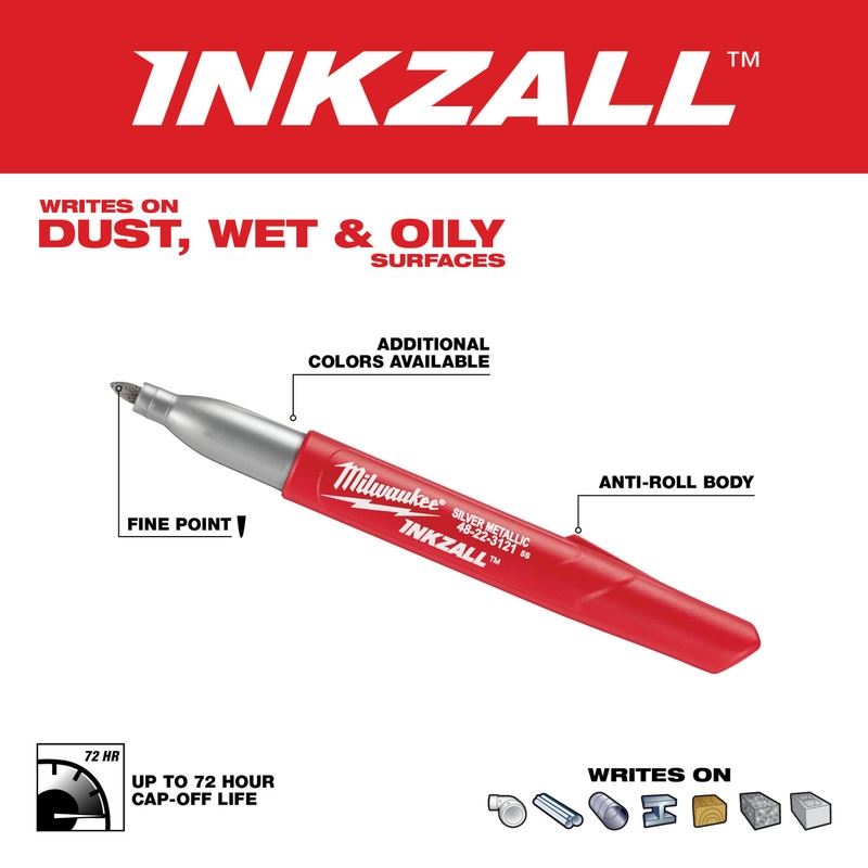 INKZALL Jobsite Markers feature clog resistant tips and the ability to write through dusty or oily surfaces. The durable marker tips are designed for writing on rough surfaces such as black pipe and structural steel. Proprietary ink dries quickly to reduce smeared markings, without drying out quickly when the cap is left off. INKZALL markers confirm to Milwaukees commitment to best-in-class durability and their relentless mission to provide innovative solutions to the end user.