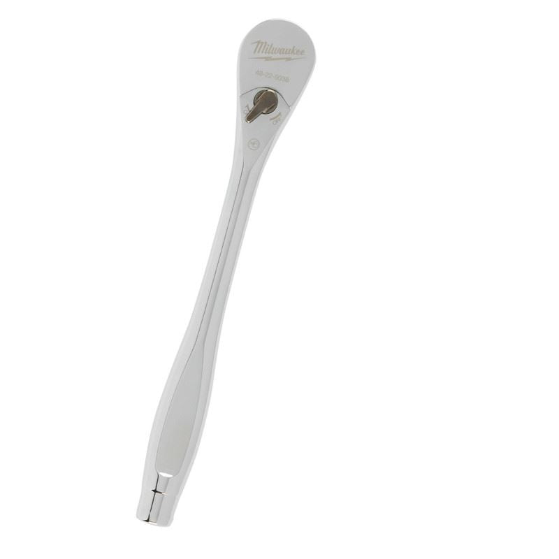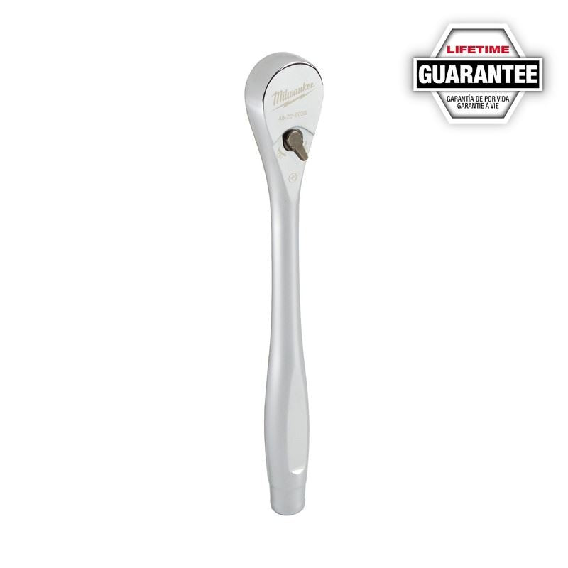 Our MILWAUKEE 3/8in drive ratchet gives users just 4 degrees of arc swing, allowing them to access their work in tighter spaces whether is under the hood of a car or the middle of a remodel. Its slim profile design and the flush directional lever of the ratchet tool offers better accessibility while using it. The construction of the tool allows for greater fastener access as well as an increase in strength during heavy duty applications. The all chrome finish allows for easy cleaning while giving the ratchet a professional look. Our ratchet is backed by our Lifetime Guarantee.