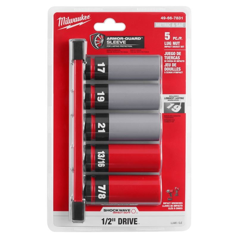 Our SHOCKWAVE Impact Duty 1/2 Drive 6 Point Lug Nut Wheel Sockets feature the Most Durable, Non-Marring Sleeve to protect rims during tire changes. The ARMOR-GUARD Sleeve is made with premium, durable plastic for Lasting Protection against cracking or shredding during wheel installation and removals. The sockets are thin-walled for easy access in tight wheel assemblies and feature a non-marring plastic insert to protect lug nuts during use. The sleeves are color-coded, Gray for Metric sizes and Red for SAE sizes, to ensure easier socket selection while also featuring stamped & ink filled sizes for the Boldest, Longest Lasting markings. Our sockets are engineered with high strength forged steel for optimized performance in heavy-duty applications. The customizable Socket Rail comes with removable end caps to add or take off socket clips for optimal storage. The dual-hole design and ring groove allow for easy socket attachment and removal. MILWAUKEE SHOCKWAVE Impact Duty Lug Nut Wheel Sockets are optimized for use with 1/2 in drive impact wrenches, drivers, ratchets, and adapters and meet ASME industry standards for thin-walled sockets