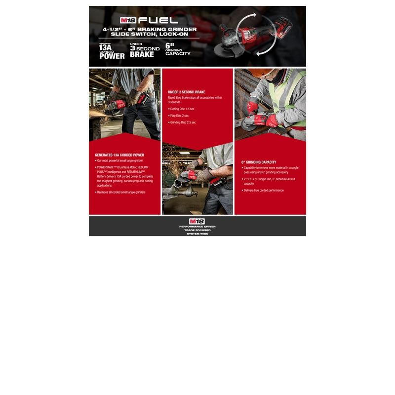The M18 FUEL 4-1/2 in. to 6 in. braking grinder is Milwaukee's most powerful small angle grinder to date, with a high performance brushless motor that generates 13 A corded power. The POWERSTATE brushless motor delivers 9,000 RPM, giving the tool the power needed to exceed performance expectations in all applications, as well as longer motor life, providing lower cost of ownership compared to brushed motors. Integrated Rapid Stop braking technology stops all accessories in 3 seconds or less, creating a safer user experience. By offering a full 6 in. capacity, users can feel confident replacing their corded tools with the M18 FUEL 4-1/2 in. to 6 in. braking grinder. The power and runtime delivered by the M18 6.0 high output batteries provides the user with more material removed per charge, making users more productive and efficient on the jobsite. Tool-free accessory changes using the FIXTEC nut and guard adjustments mean less downtime during work. Grinding wheel sold separately.