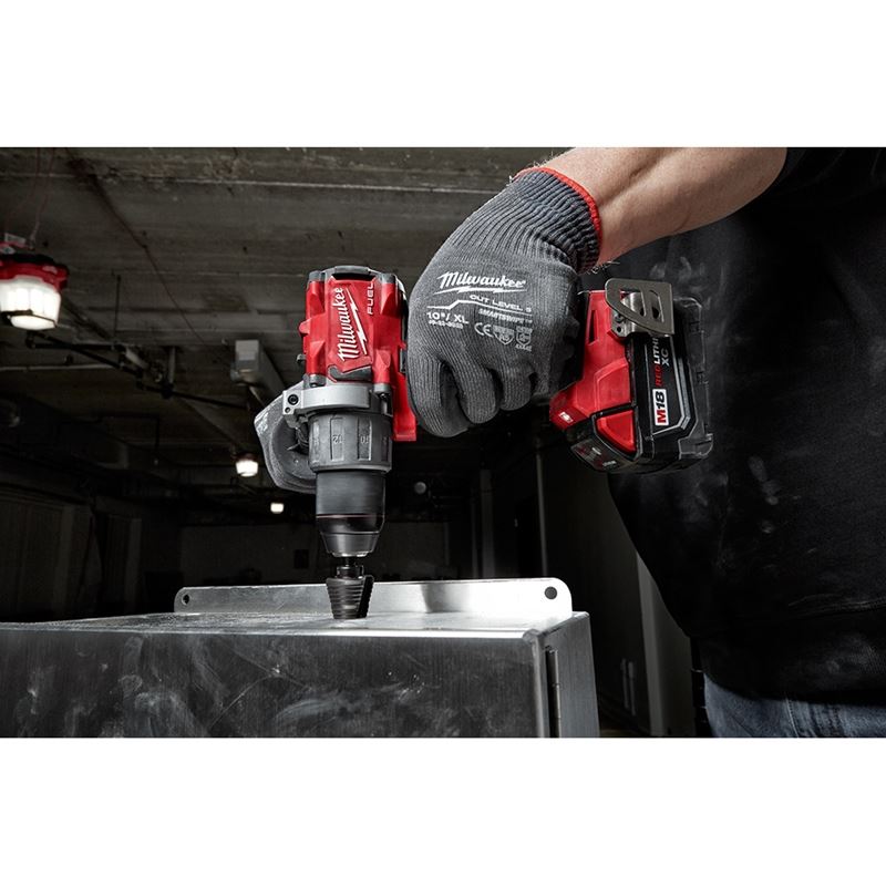 The M18 FUEL 1/2 in. hammer drill is the industry's most powerful drill delivering up to 60% more power, is up to 1.5 in. shorter and is up to 2X faster under heavy load. The POWERSTATE brushless motor delivers 1,200 in-lbs of torque and 2,000 RPMs providing fast drilling through demanding applications. At 6.9 in. in length this is the most compact drill in its class giving better access into tight spaces and reducing fatigue. The REDLINK Plus intelligence ensures maximum performance and protects from overloads, heating or over-discharge. The REDLITHIUM XC5.0 battery pack delivers more work per charger and more work over the life of the pack than competitors. The all metal ratcheting chuck is the best in class by providing increased bit grip strength and corrosion resistance.