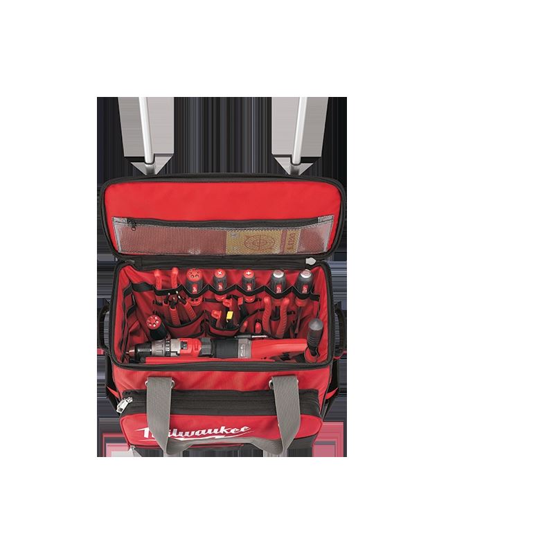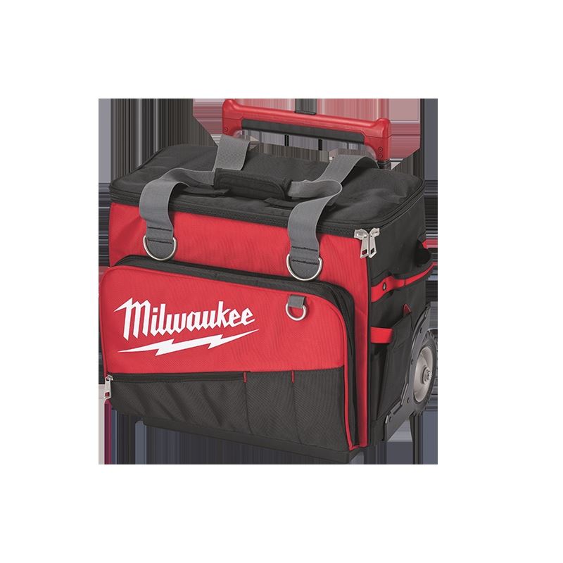 The Milwaukee 18 Jobsite Rolling Bag was designed with professional tradesman in mind and built to be the most durable and provide the most versatility of any rolling bag in the industry. Featuring 6 All-Terrain metal rimmed wheels and the industrys strongest extension handle, the 18
