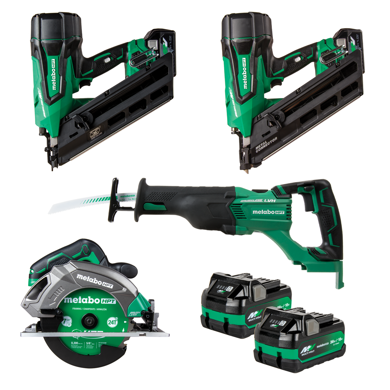 The metabo HPT NR3690DCMKIT1 FRAMING KIT includes all the necessary tools for a professional framing job. The kit features the NR3690, C1807DAQ4M, CR18DBLQ4m, NR3665DAM, 2 380083M batteries, and a UC18YSL3 charger, providing convenience and efficiency on the job.