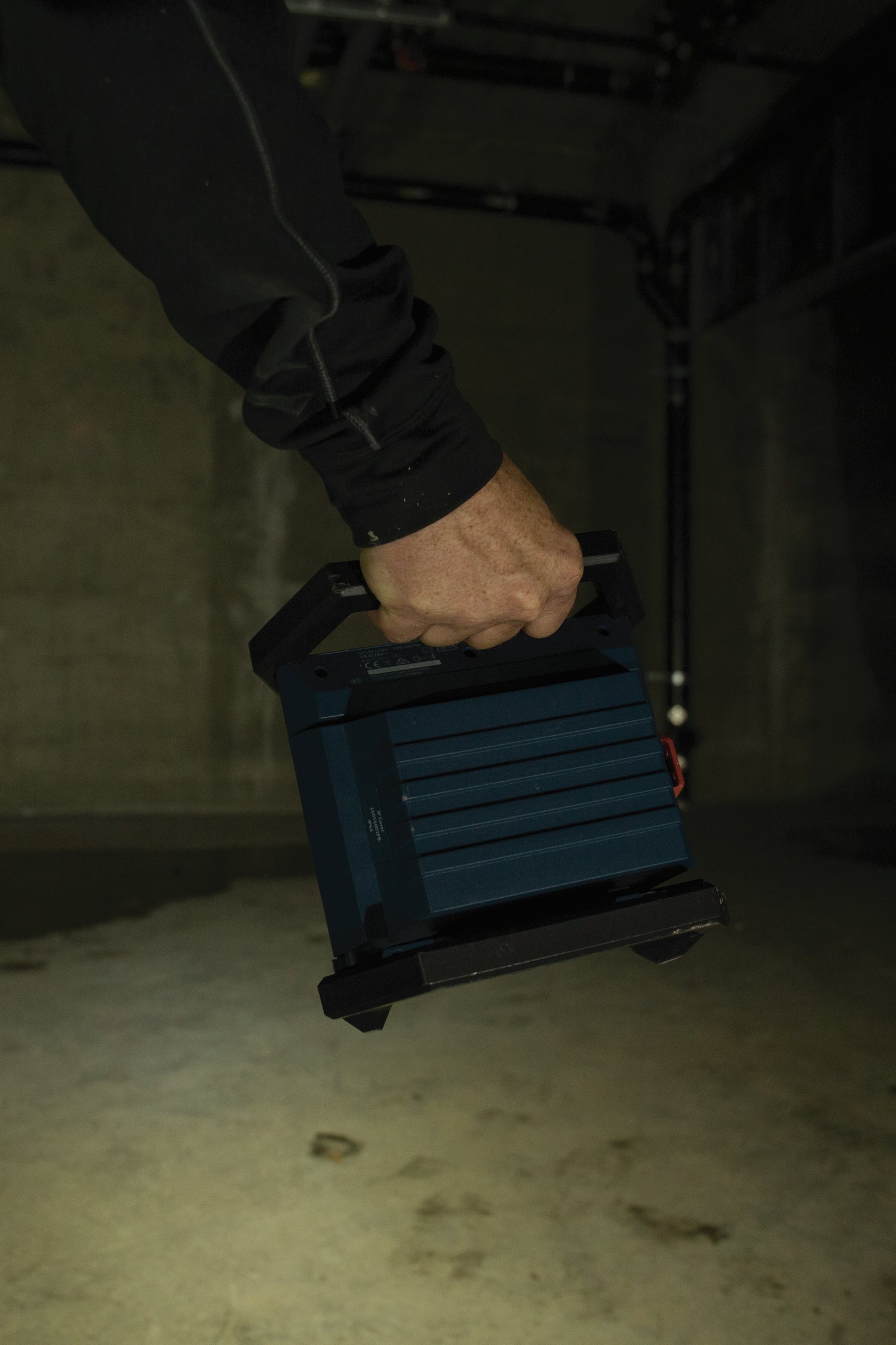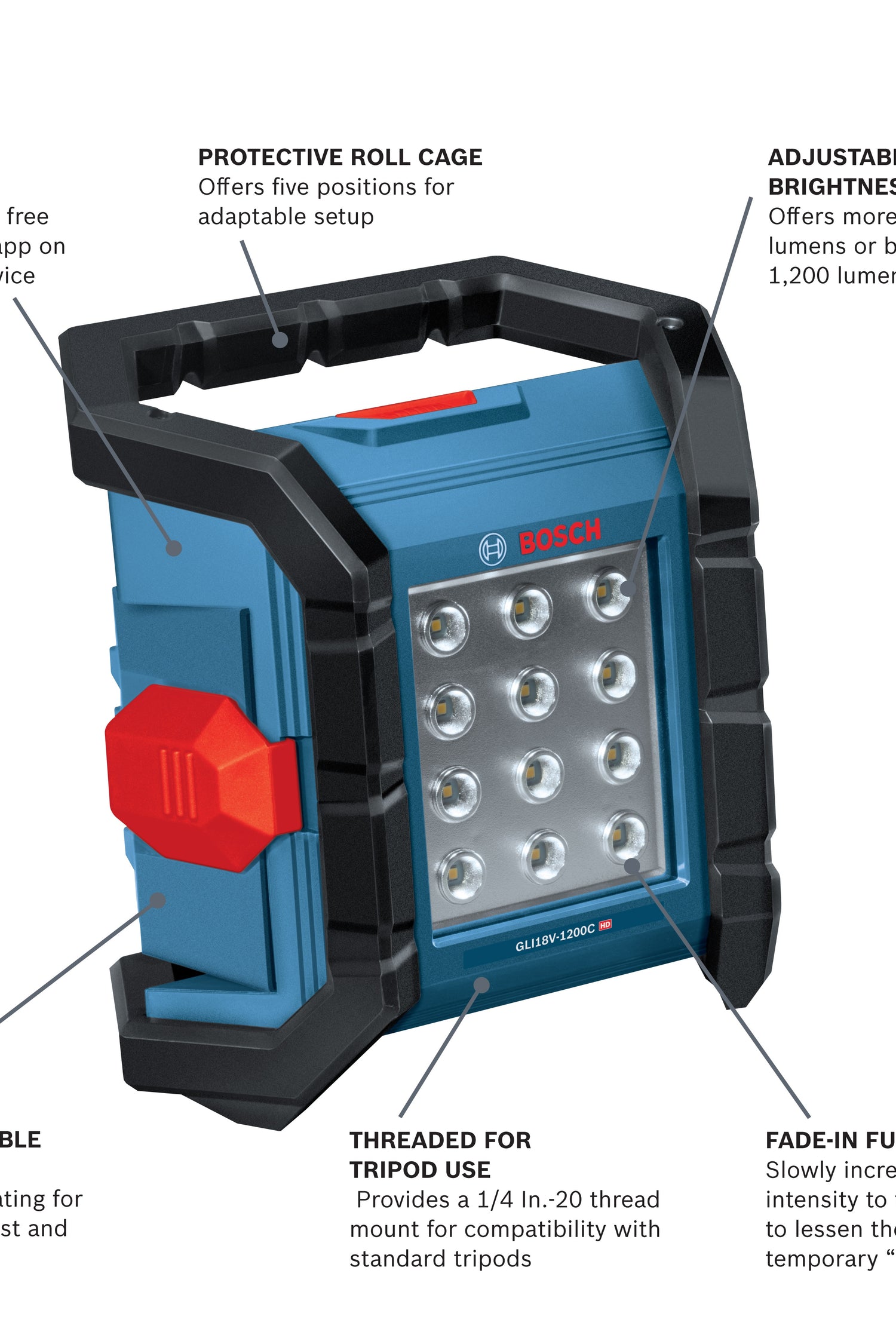This robust 18V floodlight features a protective roll cage, an IP64-rated cover resistant to dust and water damage, Bluetooth® connectivity and outstanding runtime. The Bosch GLI18V-1200C is a connected, high-powered floodlight. It adds the convenience of connectivity to a mobile device to control the light, so users can work smarter. The Toolbox App connects to the light from up to 100 Ft. away with Bluetooth®, to control the floodlight's operation. Users can turn the light on and off remotely. They can dim the light, set it on a timer, check the battery status and control groups of lights via a mobile device. The 1,200 lumen floodlight provides light for work areas and has a fade-in function. It delivers long runtime provided by rechargeable Bosch 18V batteries (not included). It has an 800-lumen dimmed mode for longer runtime, up to 17 hours on a CORE18V 8.0 Ah battery. The portable, compact light has a protective roll cage for versatile positioning and a 1/4 In.-20 thread mount. This is a bare tool; the battery and charger are sold separately.