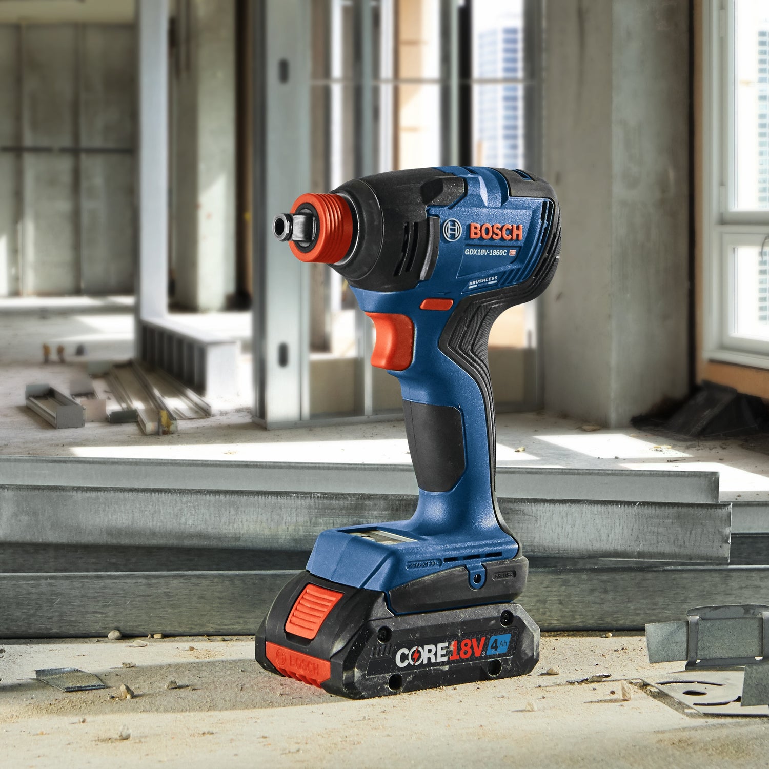 The Bosch Brushless 2-Tool Combo Kit with two CORE18V® batteries deliver professional cordless drilling and driving performance. The GDX18V-1860C Two-In-One Impact Driver/Wrench goes from impact wrench to impact driver fast. It features a 1/4 In. quick-change hex shank with power groove for bits, and a 1/2 In. square drive for sockets. Preset modes, such as Auto Stop which helps prevent overdriving, can be fine-tuned to the job at hand via the Bosch Toolbox App (connectivity module included). In reverse, with bolt mode activated, the Auto Bolt Release helps prevent accidentally dropping bolts and nuts during removal. The GSB18V-975C 1/2 In. Hammer Drill/Driver powers up to 975 In.-Lbs. of max torque and 0-31,500 beats per minute (bpm), but weighs only 3.4 Lbs. (tool only, not including battery). It has variable speed settings and a precision clutch with 25 settings. It has KickBack Control to reduce the risk of injury from sudden rotational torque reaction. The kit includes two CORE18V® 4 Ah Advanced Power Batteries, which each deliver 2x the runtime compared to previous generation BAT612 2 Ah battery.