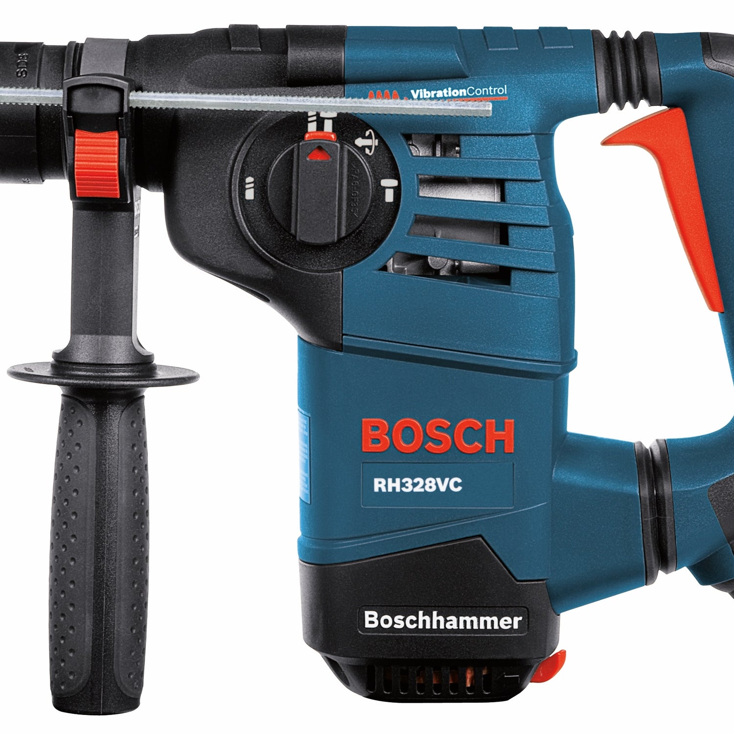 The Bosch RH328VC SDS-plus® 1-1/8 In. Rotary Hammer can deliver 2.4 Ft.-Lbs. of impact energy, but this tool weighs only 7.7 Lbs. and is a compact length of 12.5 In., for an outstanding power-to-size ratio. The 8.0-amp motor generates up to 4,000 blows per minute, making it an ideal choice for construction or demolition. The multifunction selector gives the user the versatility to match mode to application – rotary hammer, rotation-only or hammer-only mode. It has Vibration Control in the hammer mechanism and grip area to provide improved user comfort. The hammer provides an integral clutch that discontinues power transmission for bind situations, and it has Vario-Lock to set the chisel into one of 12 positions for better leverage.