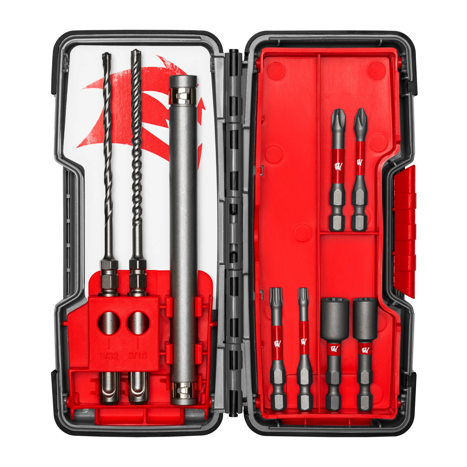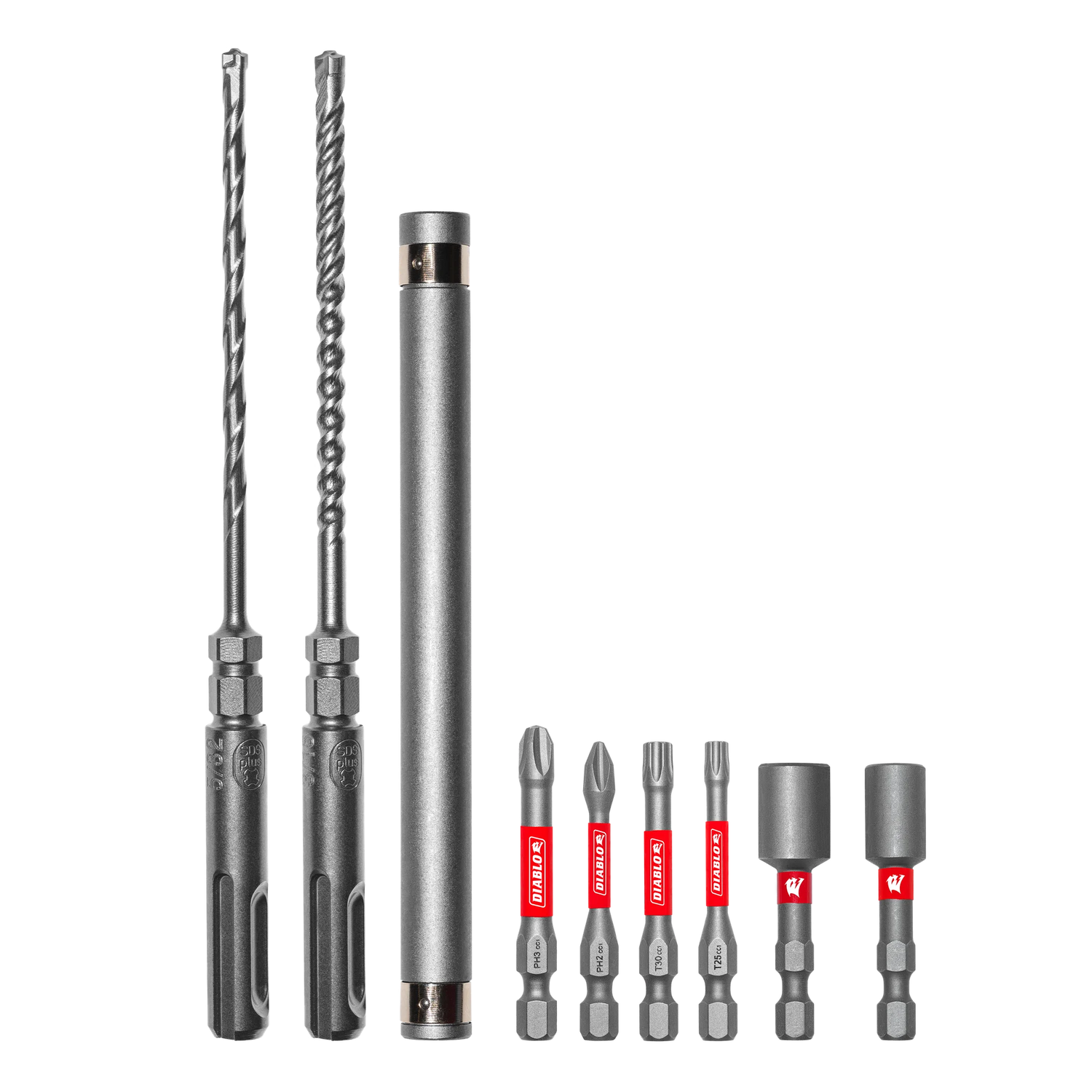 Diablo’s concrete anchor drive set is one of the strongest, most durable, and fastest installation sets. Diablo’s full-carbide head concrete anchor hammer drill bits withstand the stress of high-powered hammer drills and the impact of rebar cutting, delivering extreme durability and strength. The Phillips drive bits and magnetic nut setters deliver maximum performance and extreme durability in driving hex nuts or self-tapping screws. A magnetic anchor drive sleeve delivers the stability and rigidity necessary for precise setting of screws and anchors. Optimized for maximum performance in corded and cordless SDS-Plus rotary hammers.