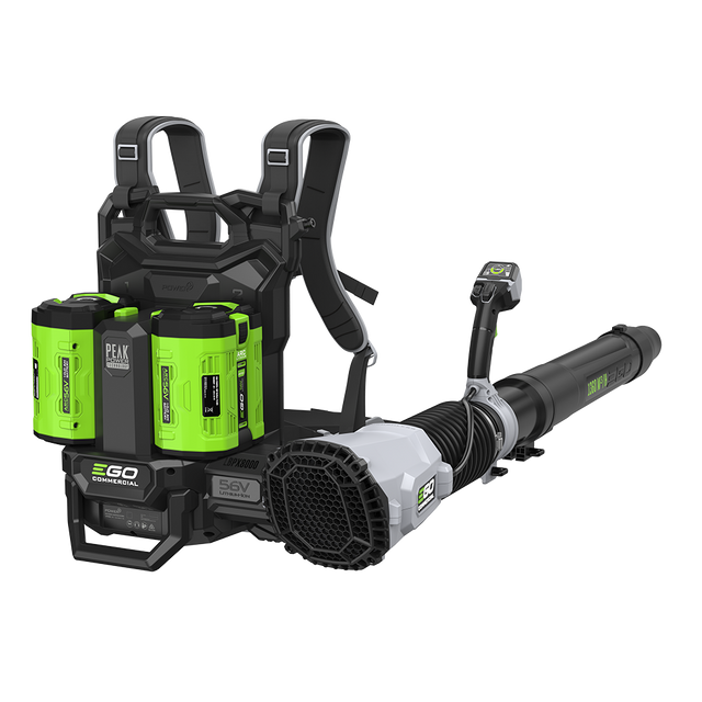 The next-generation EGO Commercial 800 CFM Backpack Blower delivers 800 CFM, air speeds up to 190 mph, and 26N push force to power through the day. This battery-powered backpack blower features a high-performance 1,900W brushless motor with intelligent electronics to deliver power equivalent to a 60cc gas engine. Tailor performance with digital controls including a battery level indicator and speed control with turbo lock on the blower’s fully adjustable hand grip and tube. Its commercial-grade construction is built for 5X longer life with UV-resistant composite housing and IPX5-rated weather resistance for all-day professional use in the toughest conditions. This Commercial 800 CFM Backpack Blower runs up to 120 minutes on low, 30 minutes on high, and 25 minutes on turbo with two included 56V 6.0Ah ARC Lithium™ batteries. Your investment is protected with a two-year commercial use warranty. Maximize uptime and grow your business with the powerful tools and smart tech of EGO Commercial.