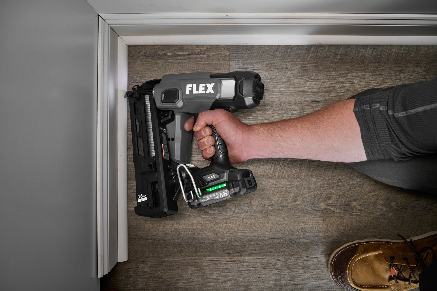 Power through moulding and trim installation with the FLEX 24V Brushless 16Ga Angled Finish Nailer. This cordless finish nailer delivers high-speed power by driving up to 3 nails per second with zero ramp up time. It drives up to 1,500 nails on a single charge with a 2.5Ah lithium-ion battery for extended runtime. The nail gun features an ergonomic quick depth adjustment lever to easily set the ideal nailing depth when driving fasteners, and its triple LED light delivers shadow-free illumination for better visibility in dark work areas. The cordless nail gun toggles between bump and sequential firing modes and has a nail indicator to easily see how many nails remain in the magazine. Dry-fire lockout avoids blank firing and damage to your work when the nail supply is exhausted. Tool-free jam clearance allows you to quickly clear jammed nails without tools for maximum efficiency when you’re on the job. The cordless nailer is compact and lightweight to conquer tight spaces with minimal fatigue. Its heavy-duty belt clip can be mounted on either side of the tool and features a lead-in profile. The finish nailer accepts 1-1/4-inch to 2-1/2-inch 16-gauge fasteners. This cordless nailer delivers the FLEX Advantage of unmatched battery power, runtime, and fast charging. Kit includes the 16Ga Angled Finish Nailer, 2.5Ah lithium battery, 160W Fast Charger, belt clip, (3) no-mar tips, and a FLEX bag.