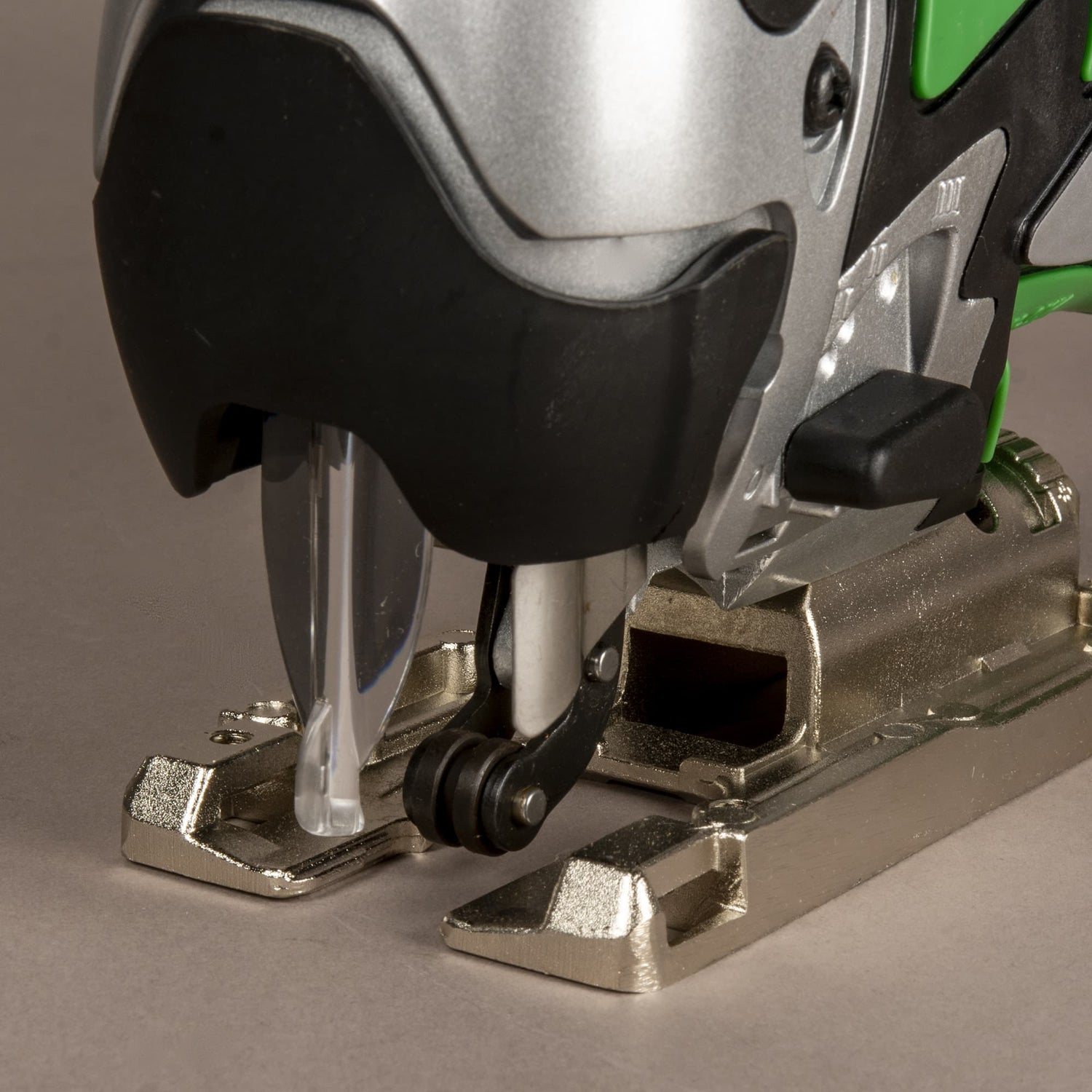 Soft, elastomer compound that covers the jig saw absorbs vibration, prevents slippage and provides maximum control while cutting