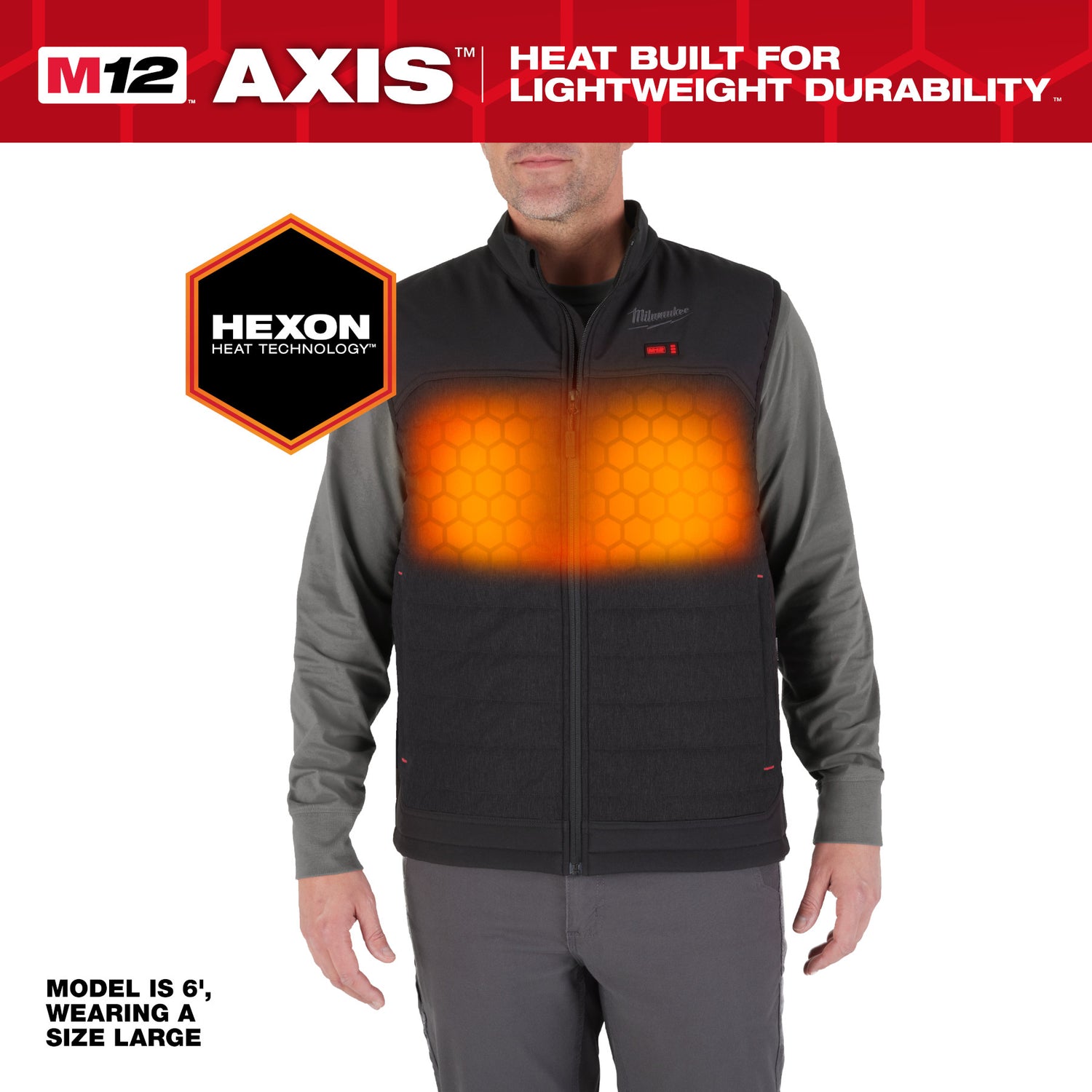 Our M12™ Heated AXIS™ Vest delivers HEAT BUILT FOR LIGHTWEIGHT DURABILITY. Powered by Milwaukee’s NEW HEXON HEAT TECHNOLOGY™, this vest STAYS WARMER FOR LONGER in all temperatures, delivers the FASTEST HEAT UP TIME and offers GREATER HEAT COVERAGE throughout the garment. Whether facing freezing outdoor temperatures or navigating spaces with minimal heat indoors, this vest adapts to its environment to deliver effective heat in any condition. By integrating HEXON HEAT TECHNOLOGY™ and 2X more insulation, optimal comfort and mobility are achieved. With ground-up developed AXIS™ ripstop fabric, this MILWAUKEE® vest provides robust protection against the elements without sacrificing movement. The compressible, lightweight construction provides warmth whether worn as a mid-layer or durable exterior layer. The hidden battery pass-thru pocket allows for front or back battery placement, increasing versatility depending on the situation. Our Milwaukee® Heated Gear is developed in collaboration with feedback from users across the trades through continuous jobsite research.