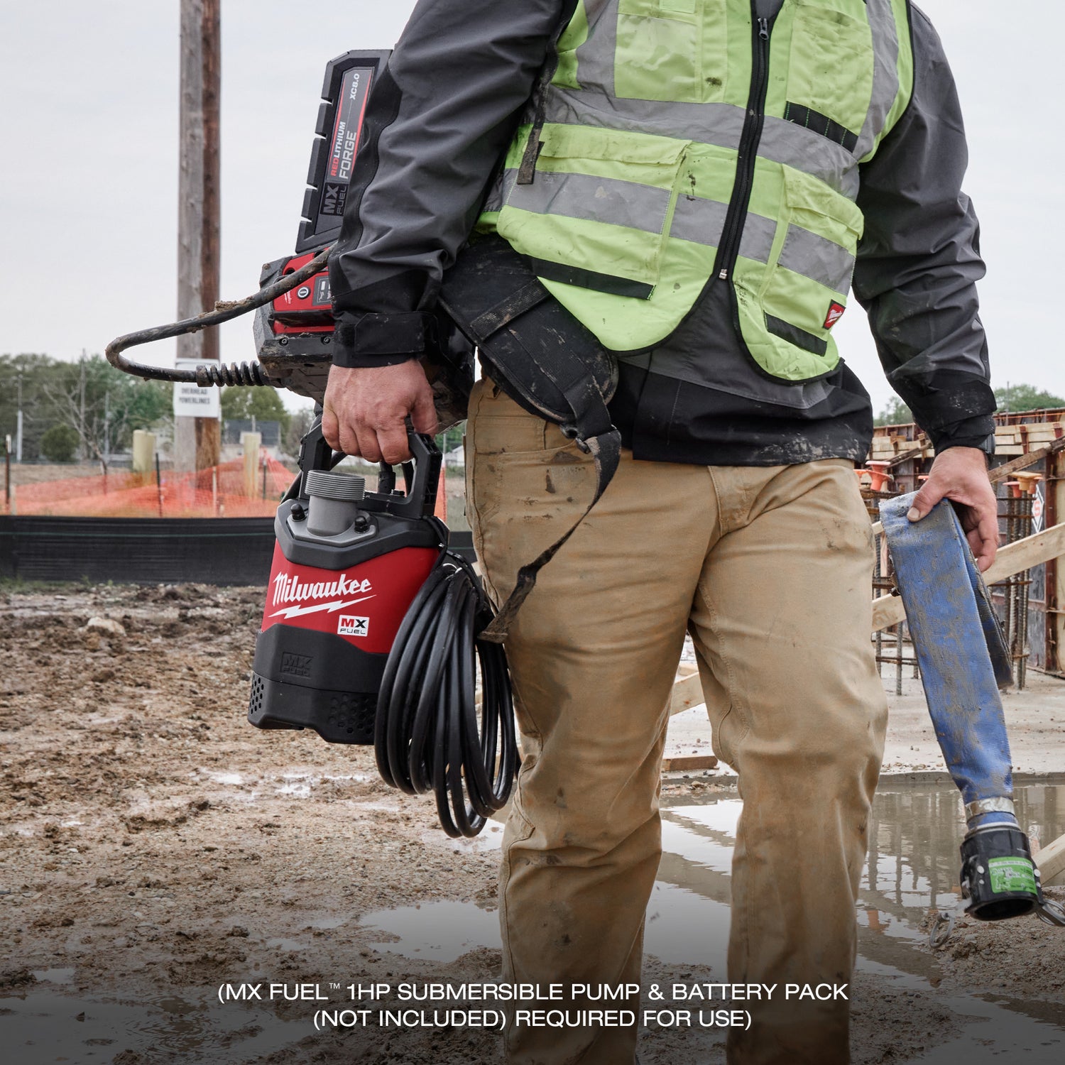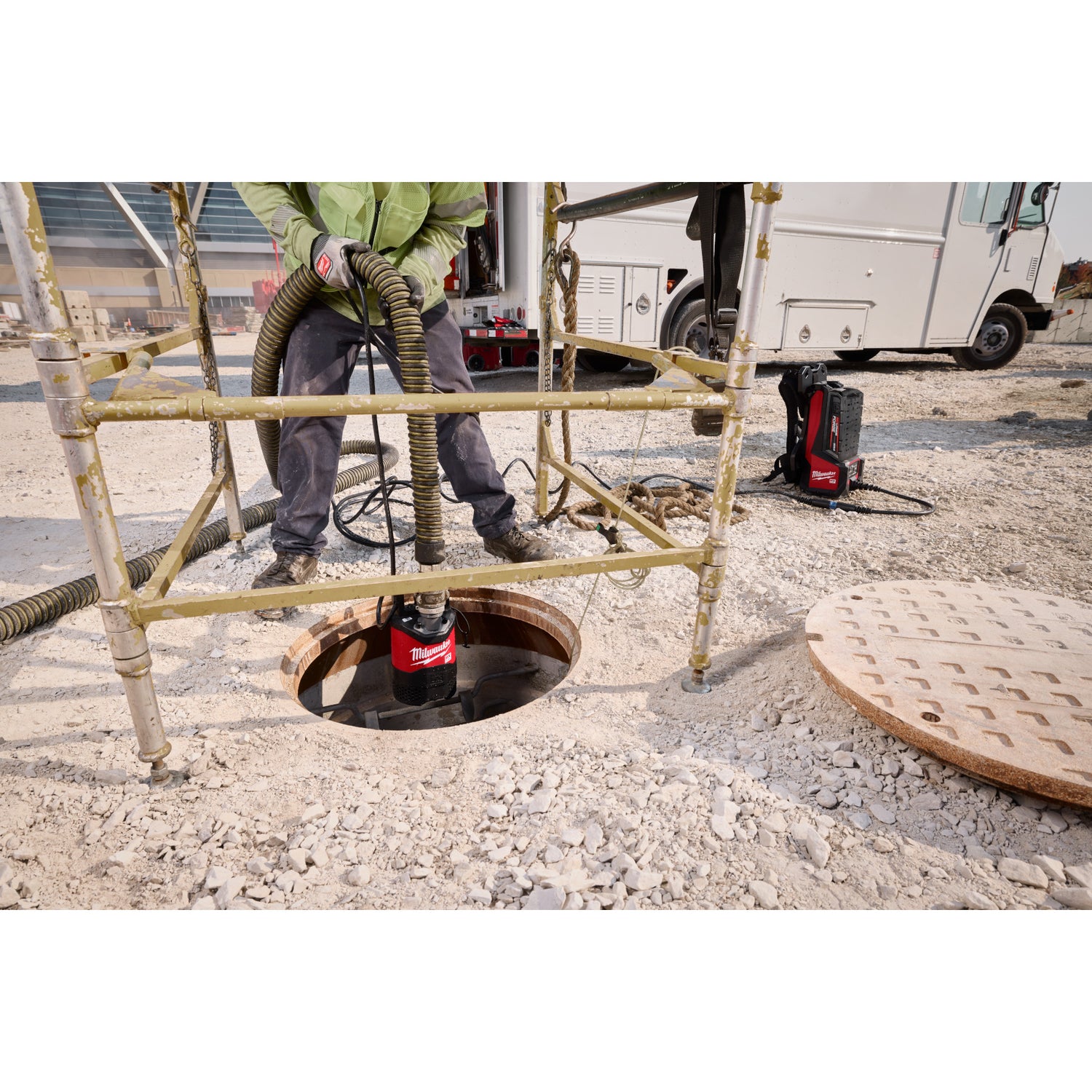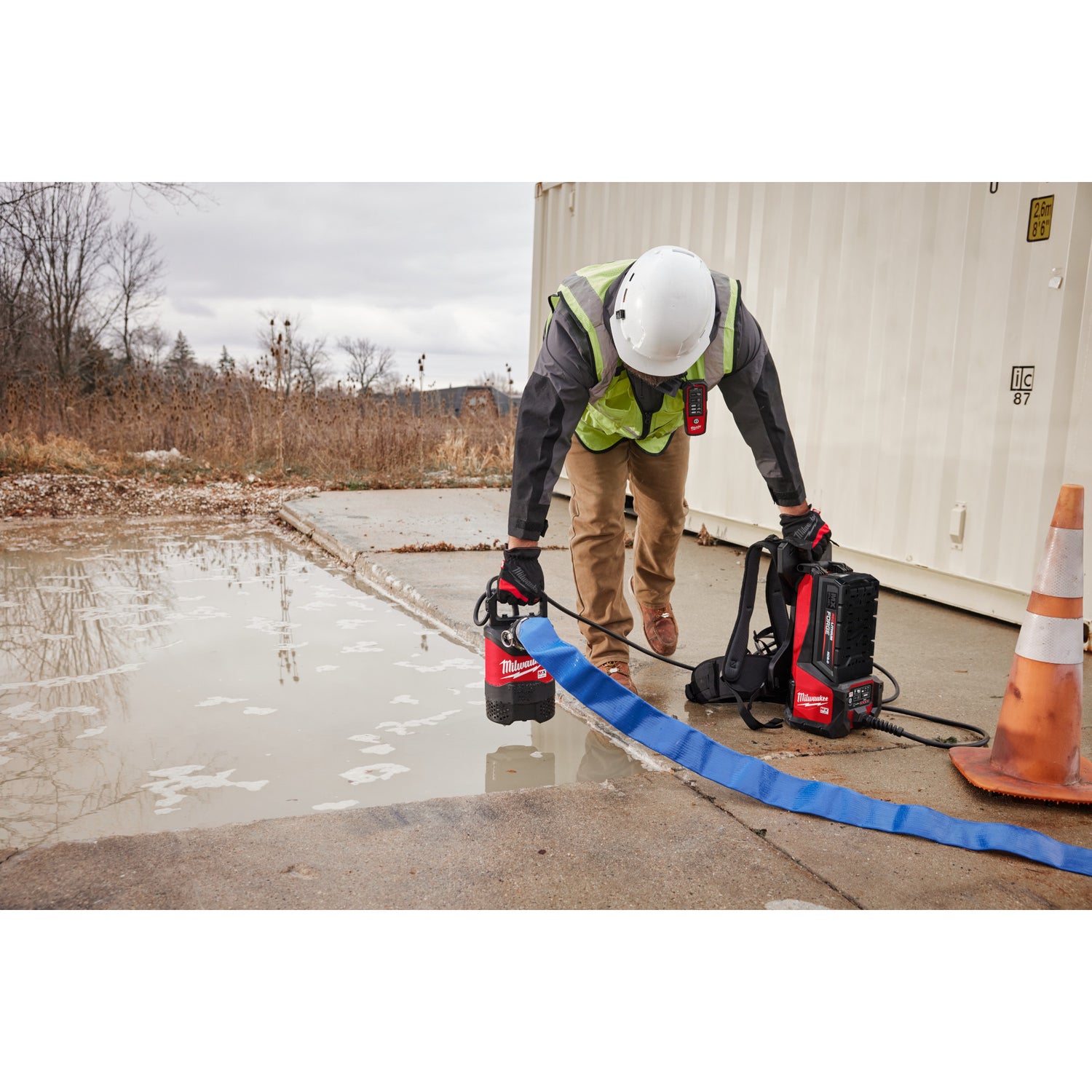 Our MX FUEL™ 1HP 2” Submersible Pump provides the portability to pump anywhere by eliminating the need to chase power and work safer with zero emissions in vaults, manholes, trenches, and other confined spaces without a generator. Milwaukee’s Submersible Pump offers users three pumping modes (Auto, High, & Low) providing the ability to select the performance needed. Utilizing Auto-Mode, the pump automatically detects the water level, shutting the POWERSTATE™ Brushless Motor off with two inches of water remaining. The pump adjusts performance over time to match changing flow and optimizes run-time. Auto-Mode saves you time and protects the pump from running dry. The Submersible Pump includes a wireless remote that notifies you of the status, reducing the need to supervise the pump. REDLINK PLUS™ Intelligence ensures optimal performance and provides overload protection to protect your machine and battery during the toughest applications. With the MX FUEL™ XC8.0 FORGE™ battery, the MX FUEL™ Submersible Pump delivers between 27 minutes (High Mode) and 110 minutes of run-time on Low Mode. On Auto-Mode, users can expect a minimum of 40 minutes of run-time and 2,800 gallons per charge as the pump optimizes run-time and flow rate. The Portable Pump Power Base is ONE-KEY™ Compatible. You can track, manage, and secure equipment from your mobile device or computer. The Submersible Pump is compatible with all MX FUEL™ batteries.