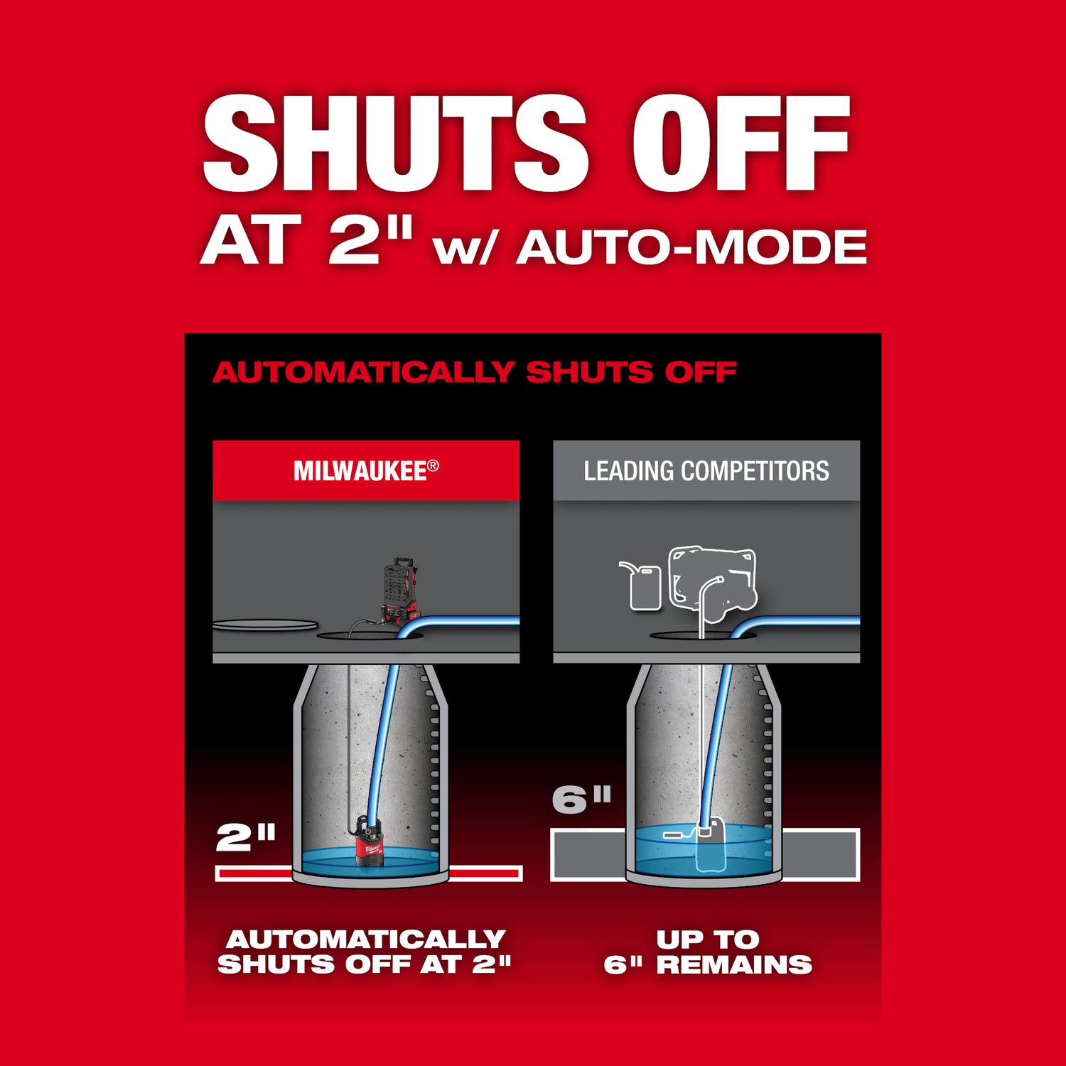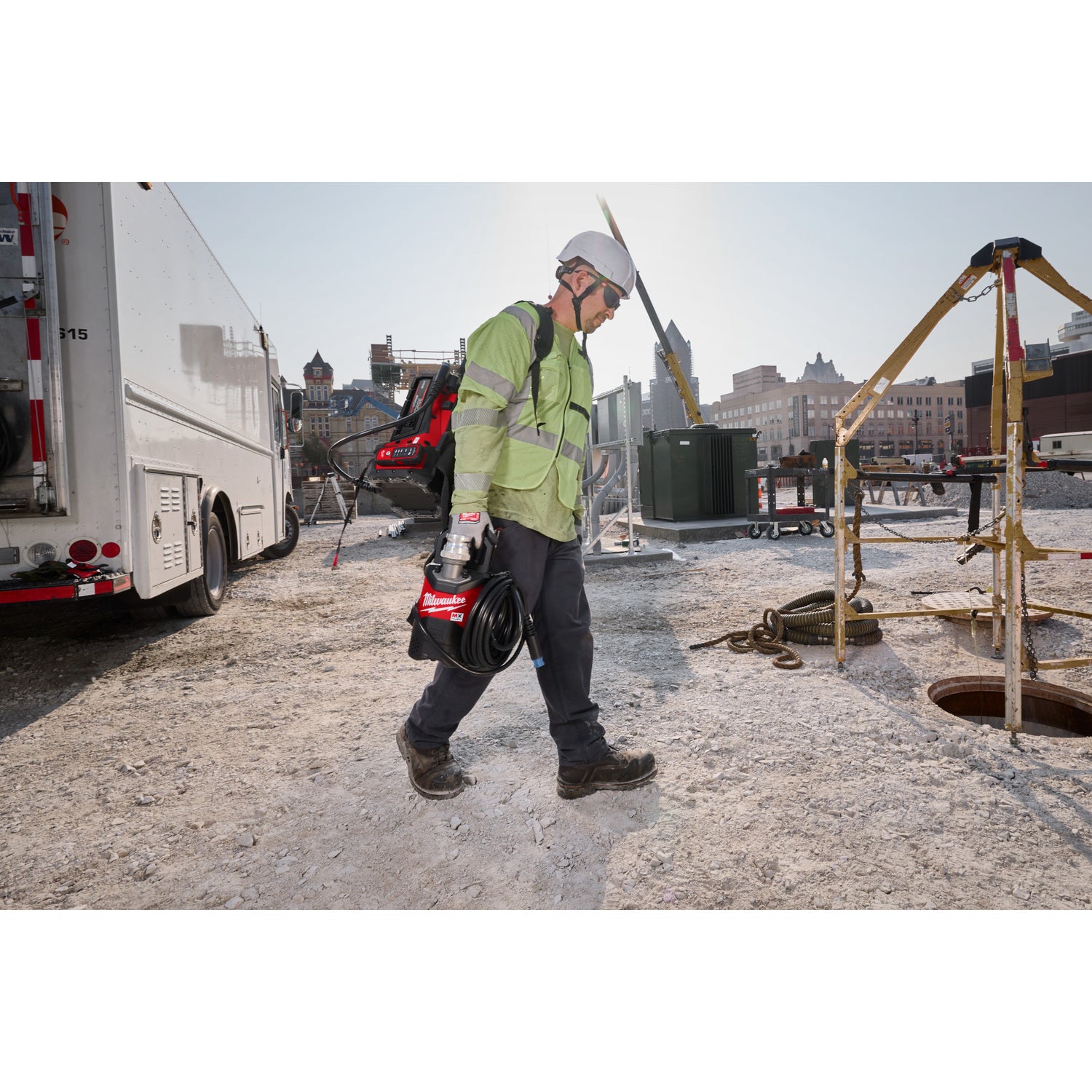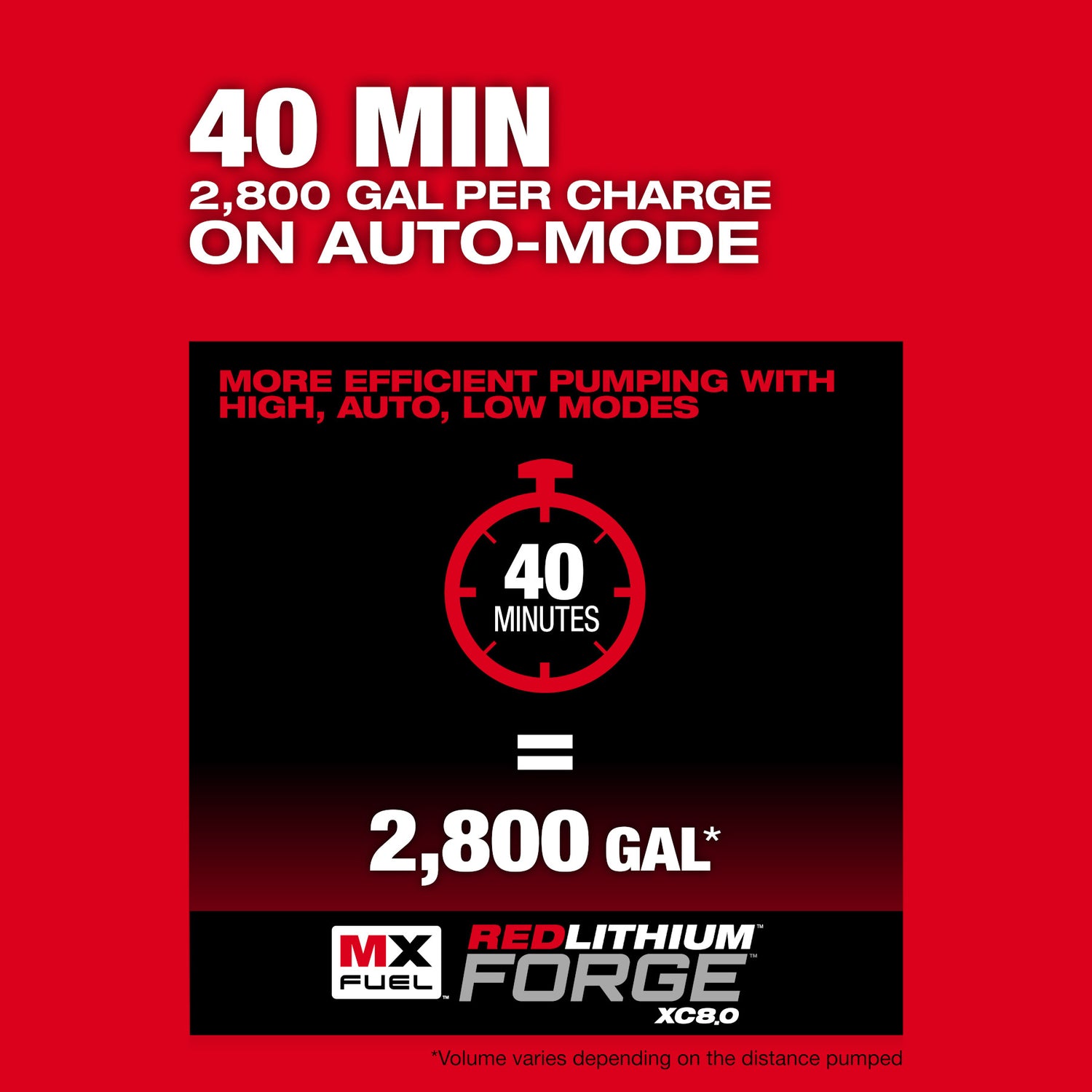 Our MX FUEL™ 1HP 2” Submersible Pump provides the portability to pump anywhere by eliminating the need to chase power and work safer with zero emissions in vaults, manholes, trenches, and other confined spaces without a generator. Milwaukee’s Submersible Pump offers users three pumping modes (Auto, High, & Low) providing the ability to select the performance needed. Utilizing Auto-Mode, the pump automatically detects the water level, shutting the POWERSTATE™ Brushless Motor off with two inches of water remaining. The pump adjusts performance over time to match changing flow and optimizes run-time. Auto-Mode saves you time and protects the pump from running dry. The Submersible Pump includes a wireless remote that notifies you of the status, reducing the need to supervise the pump. REDLINK PLUS™ Intelligence ensures optimal performance and provides overload protection to protect your machine and battery during the toughest applications. With the MX FUEL™ XC8.0 FORGE™ battery, the MX FUEL™ Submersible Pump delivers between 27 minutes (High Mode) and 110 minutes of run-time on Low Mode. On Auto-Mode, users can expect a minimum of 40 minutes of run-time and 2,800 gallons per charge as the pump optimizes run-time and flow rate. The Portable Pump Power Base is ONE-KEY™ Compatible. You can track, manage, and secure equipment from your mobile device or computer. The Submersible Pump is compatible with all MX FUEL™ batteries.
