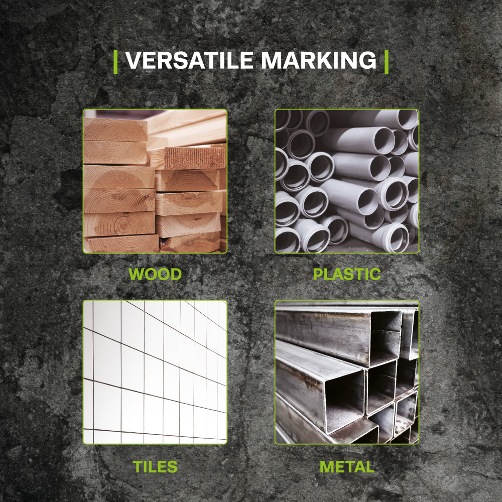 Marks on most common materials including wood, plastic, ceramics and metal.