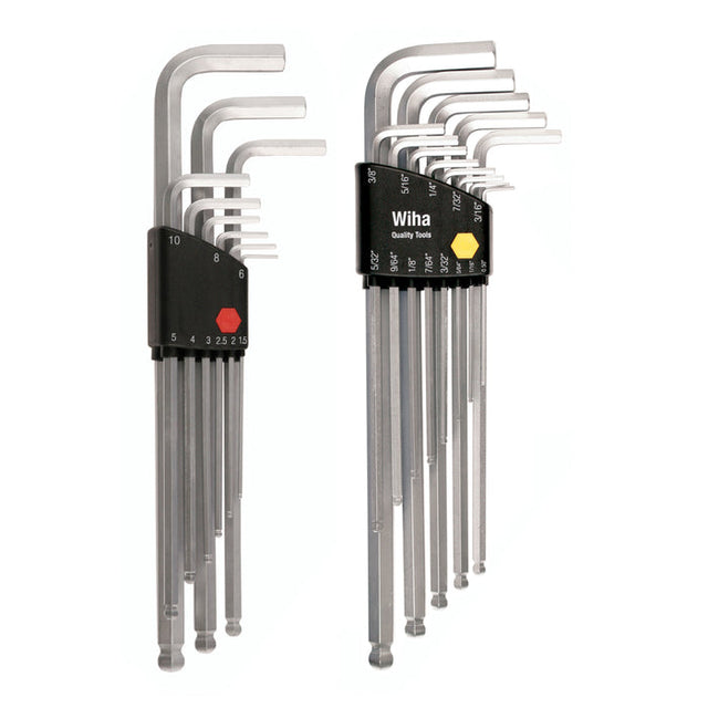 The Wiha 22-Piece Ball End Hex L-Key Set offers both Inch and Metric sizes, providing an essential tool kit for a variety of fastening tasks. These extra-long L-keys feature Wiha's exclusive Chrome-V-Moly Super Tool Steel, providing strength and resistance to wear for long-lasting performance. Designed with Ball Ends, these L-keys allow for up to 25° off-center access, making them ideal for hard-to-reach fasteners, while still maintaining excellent grip and torque. The through-hardened construction ensures maximum durability, enabling the keys to withstand heavy use without compromising their shape or strength.