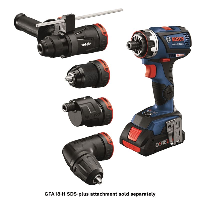 The Bosch 18V Flexiclick® Chameleon 5-In-1 Drill/Driver System is designed for professionals who are looking for a high-torque connected-ready drill/driver that redefines their limits to get the tough jobs done. The drill can produce up to 535 In.-Lbs. of torque. Users may also add an optional rotary hammer adapter (not included), converting the drill into an SDS-plus® rotary hammer, for drilling into masonry. The tool has a 1/4 In. hex bit holder with quick release, and the system includes three pro-grade attachments: a right-angle, an offset-angle and a 1/2 In. keyless metal chuck attachment. The kit includes a CORE18V 4.0 Ah Compact Battery with next-gen Li-ion 21700 cell technology and an 18V charger. The drill features Bluetooth® connectivity, which uses an optional Bosch Connected Tool Module to connect the tool to the free Bosch Toolbox app on a connected device, to customize settings and provide detailed feedback. The drill has KickBack Control, a precision clutch and an efficient EC Brushless motor.