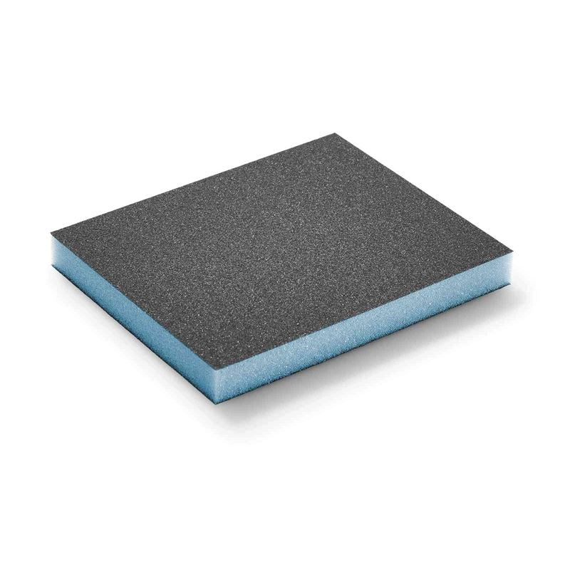 Double -side sponge with unique grit coating on soft core foam compresses to conform to sensitive surface profiles providing even surface preparation with even pressure distribution.