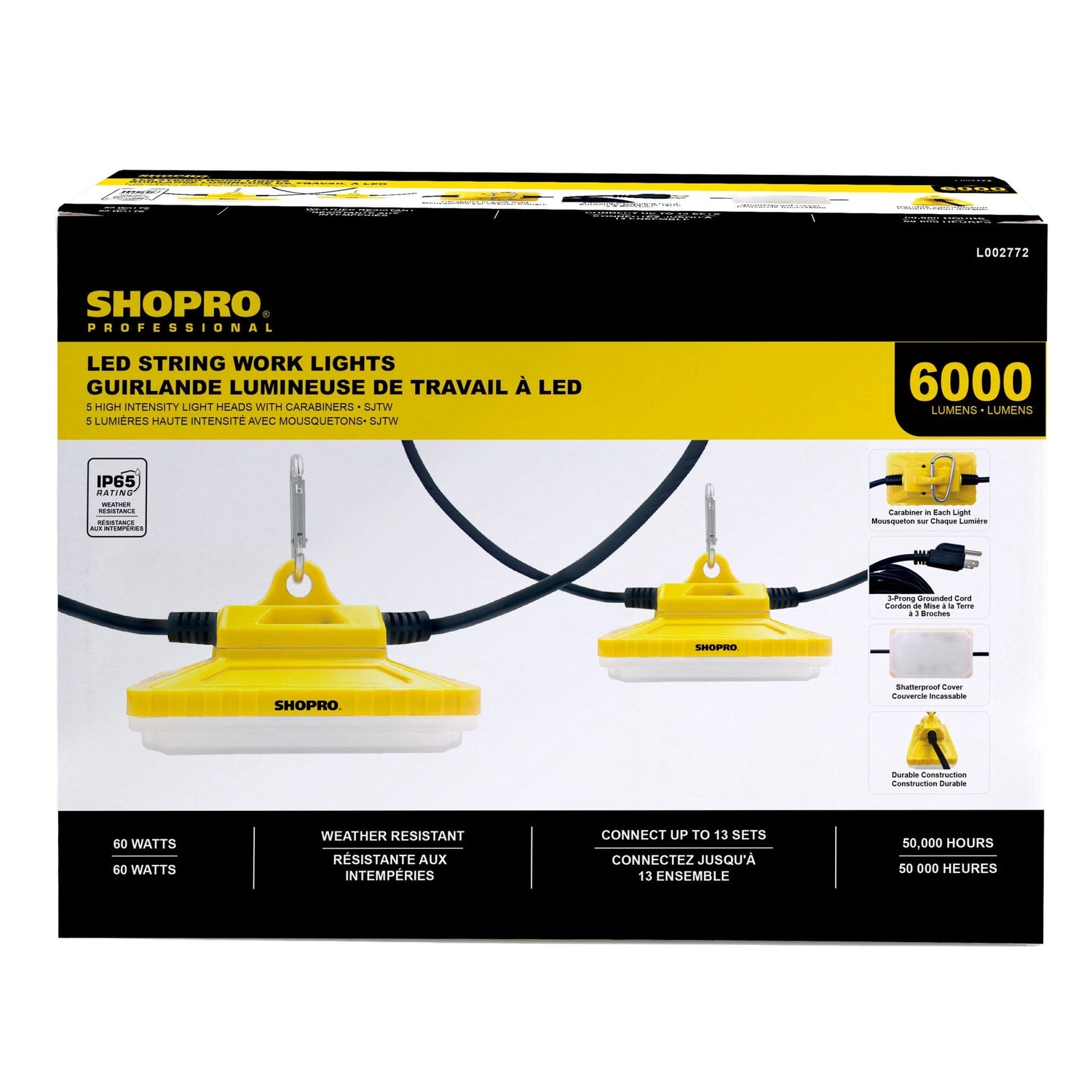 The SHOPRO L002916 LED Work Light offers exceptional illumination with up to 10,000 lumens on AC power and 5,000 lumens on battery. Featuring six adjustable brightness modes and dual rotatable heads, it brightens up to 2,150 sq. ft. Ideal for construction, workshops, and emergency use, it operates on both 120V mains and a rechargeable 16V battery. With a 2-hour runtime and a quick 3-hour recharge, this versatile work light ensures reliable performance wherever you need it.