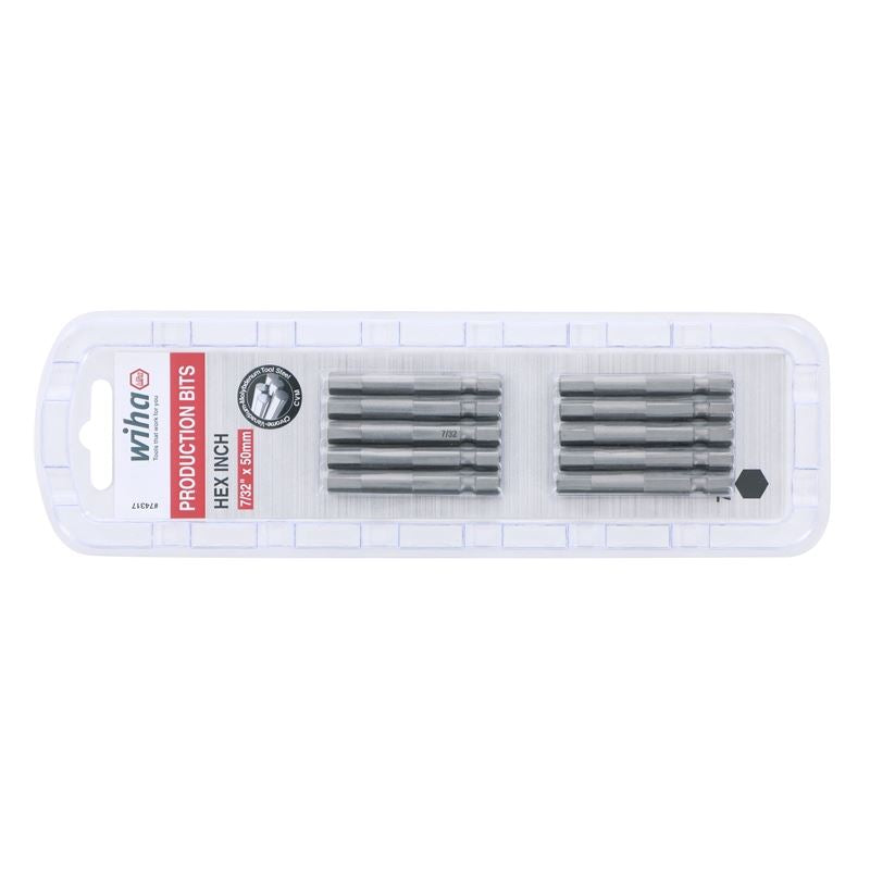 Hex Inch Power Bit 7/32in x 50mm 10 bit packHex Power Bits With Exact Fit Machined Tips WIHA Exclusive CRM-72 Modified Tool SteelMaximum Performance Through HardenedNatural Blasted FinishStandard 1/4in Hex DriveGuaranteed Quality Made in Germany