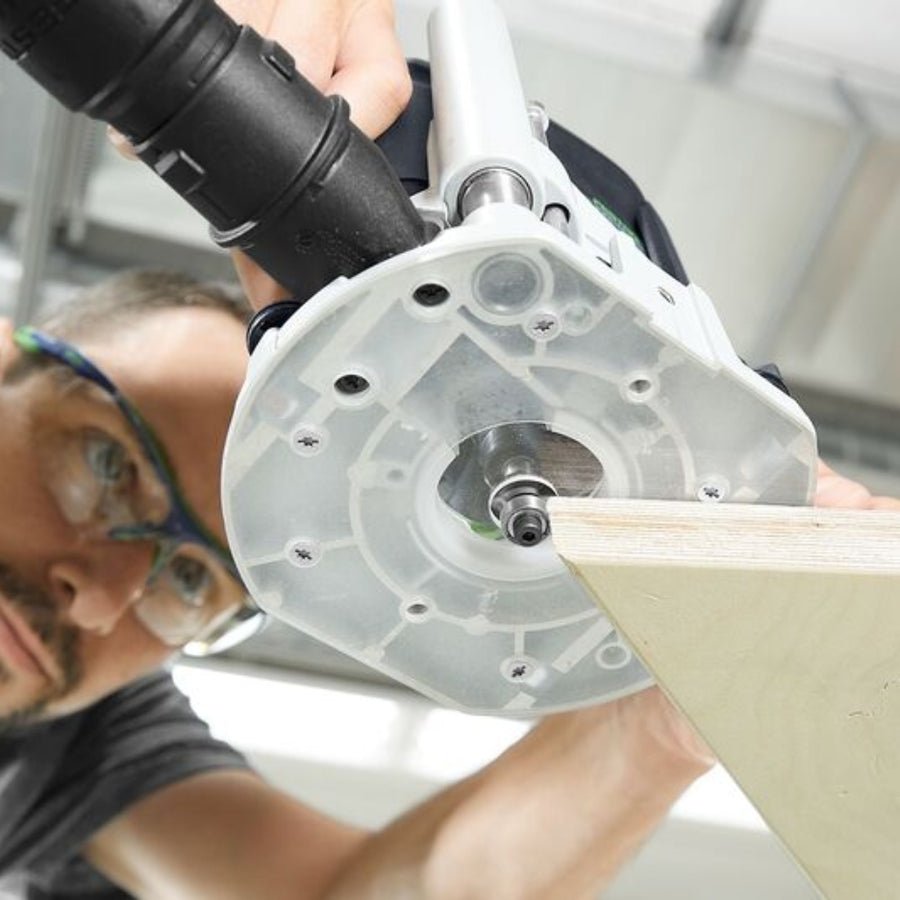 In combination with the light ring, the transparent base provides a perfect view of the workpiece. The small opening makes reliable guidance of the router possible even in corners and without tipping over.
