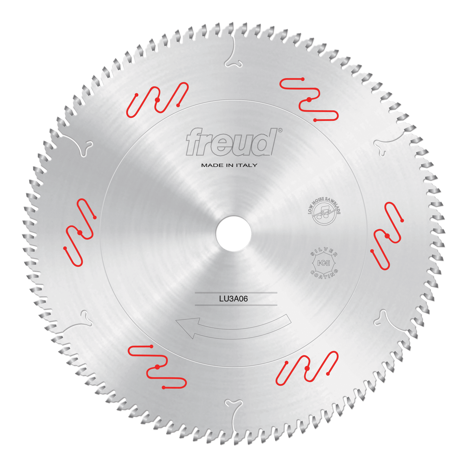 The Freud LU3A06 blade is made with their own Micrograin Carbide, providing precision and durability. With an ATB 38° tooth and variable cutting angle, this blade delivers a smooth and clean cut. Its anti-vibration design and Silver I.C.E. Coating ensure a quiet and cool operation. Perfect for sizing bilaminated panels with a flawless finish on both sides.