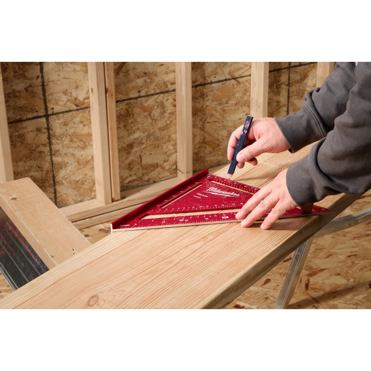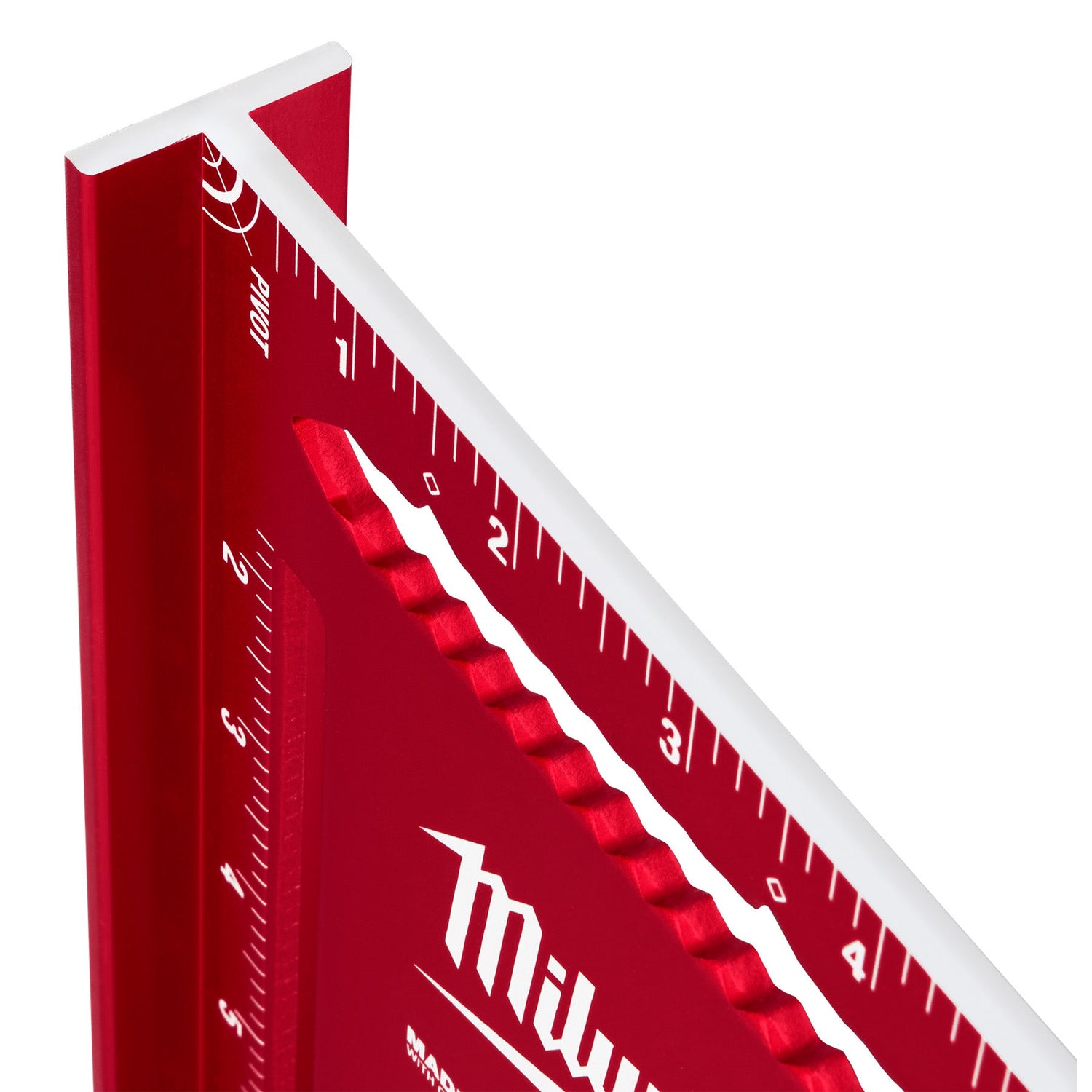 Our 12" Rafter Square has a stronger frame to withstand harsh jobsite conditions and provides better holds on material with its wider 1-1/8" heel. With 1/8" scribe notches from 1"-10", this rafter square makes ripping lumber easier and more accurate. Our 12-inch rafter square also has high-visibility laser-etched markings, so it's easier to read. All Milwaukee squares are backed by a Limited Lifetime Warranty.