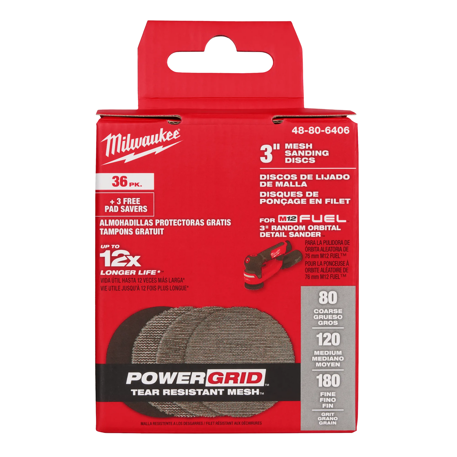 Milwaukee 3” Assorted 80, 120, 180 Grit Mesh Sanding Discs with POWERGRID™ Tear Resistant Mesh – 36 pk + 3 Pad Savers