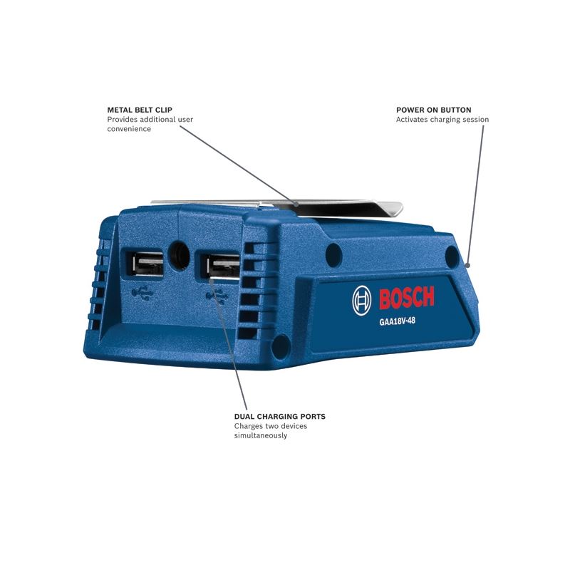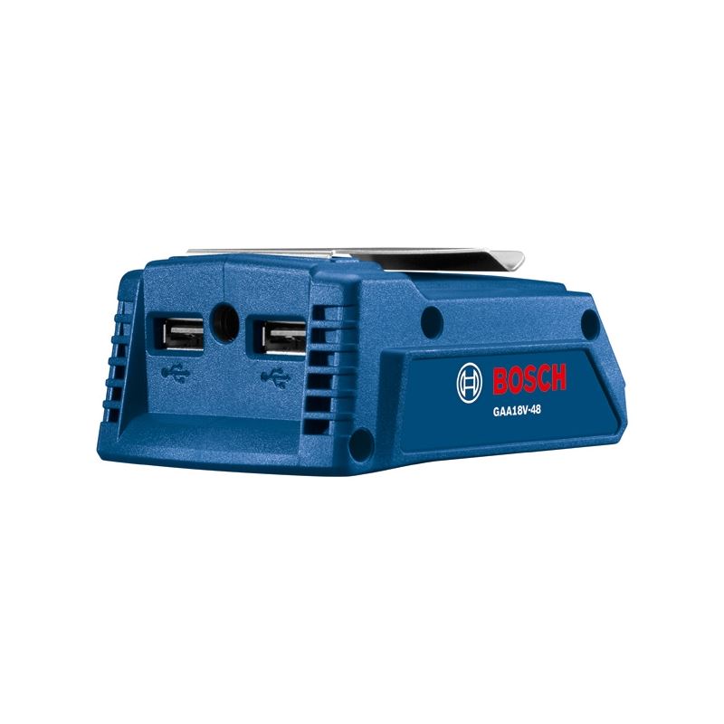 The Bosch GAA18V-48 18V USB Portable Power Adapter helps users quickly power up their other important tools - phones, tablets, and more - anywhere on the jobsite using an 18V Bosch Lithium-ion battery. The GAA18V-48 USB power adapter works with Bosch 18V Li-ion batteries delivering power to any 5V USB or 12V DC device(s), and is capable of charging two devices simultaneously. It is designed to withstand jobsite conditions and keep working. The output on this charger is 4.8 Amps, enough power to get mobile devices ready in a hurry. When simultaneously charging two devices, each output is 2.4 Amps Plus, the Bosch Portable Power adapter includes a port compatible with Bosch heated workwear, enabling users to stay warm during long cold days. The charger adapts to the device being charged, allowing for optimal charging current. while preventing overcharging by entering sleep mode once charging is complete. A metal belt clip is also included for additional storage and transportation convenience.