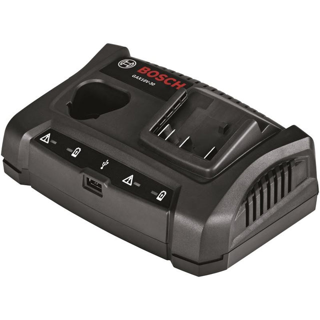 The Bosch GAX18V-30 18V/12V Dual-Bay Charger can charge Bosch 18V, Bosch 12V Max and mobile phone batteries. This one charger provides the ultimate convenience to users who need to charge both Bosch 12V Max batteries and Bosch 18V batteries. It also provides a 2.4 Amp max USB port to power up a cell phone (and other devices). It quickly charges batteries and it provides LED indicators so users can monitor the charging while they work. It charges a spent Bosch 18V 4.0 Ah battery in 85 minutes and a spent Bosch 12V Max 2.0 Ah battery in 45 minutes.