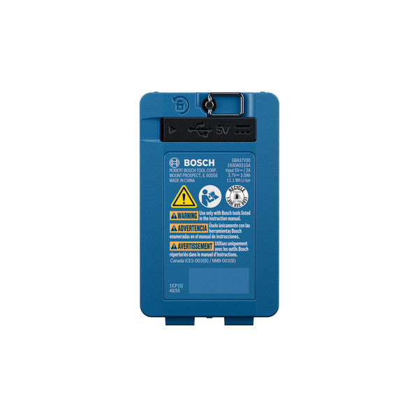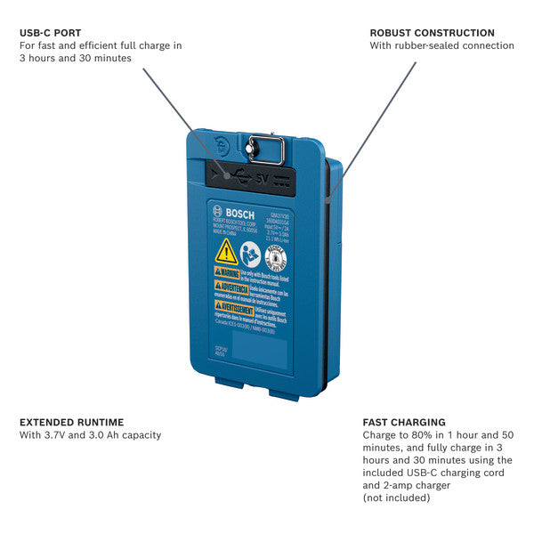 The Bosch GBA37V30 3.7V Lithium-ion 3.0 Ah Battery delivers outstanding power and convenience for Bosch Laser Tools. The battery boasts an impressive charging speed, delivering 80% charge in 1 hour and 50 minutes using a 2-amp charger (not included). Fully charge in 3 hours and 30 minutes with the included fast USB-C cable that allows for continuous charging while in use for increased productivity and less downtime on the job. A rubber-sealed connection helps safeguard the battery on even the toughest jobsites.