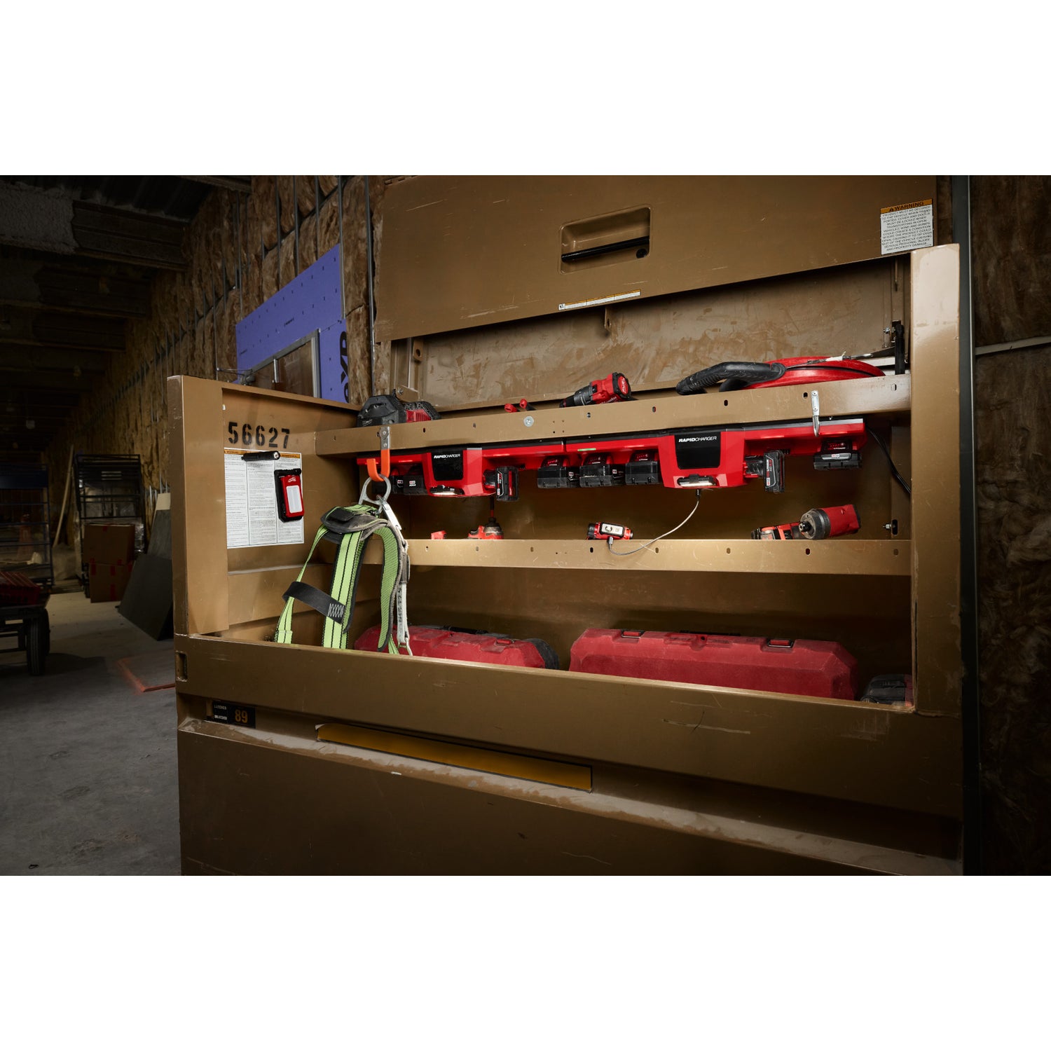 Our M18™ and M12™ Gangbox Rapid Charger is uniquely designed for users working out of gangboxes and other steel storage spaces on commercial job sites. By utilizing the strong magnetic base or cleat, the rapid charger can be mounted in multiple different orientations, maximizing storage space within a gangbox. This battery charger includes a 450L flood light, which illuminates stored supplies, allowing users to spend less time at the gangbox and get back to work quicker. This four-bay M18™ and M12™ charger can charge two batteries simultaneously at a rapid rate and then automatically move to the next two, leading to less downtime. The charger features two M18™ Only bays and two M18™ and M12™ Hybrid Bays, allowing users who operate with both systems to utilize one charger. The M18™ and M12™ Gangbox Rapid Charger include (2) USB-C 15W ports, providing users the ability to charge small devices such as Milwaukee's rechargeable personal lighting solutions, phones, and tablets. The rapid charger is optimized for all major models and brands of gangboxes and steel storage found on commercial job sites. Through its faster charging and intentional design, the M18™ and M12™ Gangbox Rapid Charger are redefining the way our users charge batteries on commercial job sites.