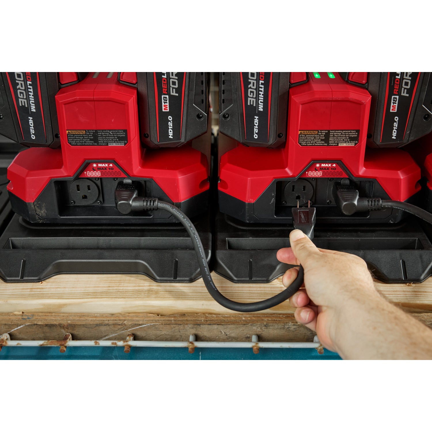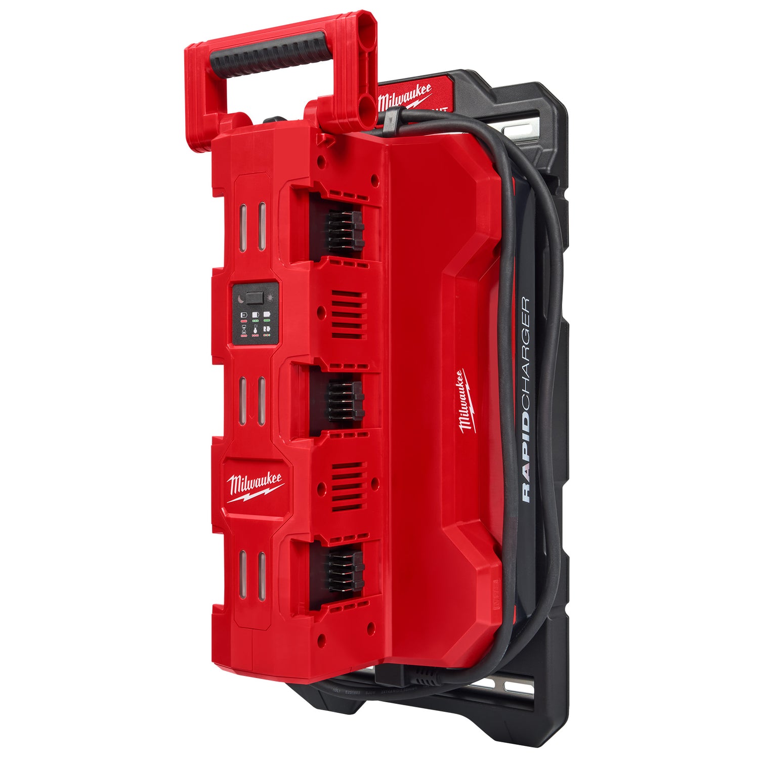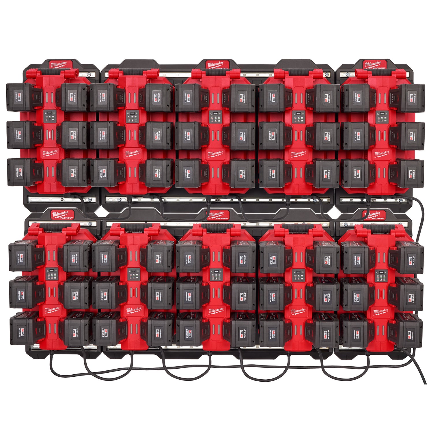 The MILWAUKEE® M18™ Six Bay Daisy Chain Rapid Charger is the most versatile shop-to-mobile charging solution. The Six Bay Daisy Chain Rapid Charger features dual charge modes for optimized rapid daytime or overnight charging. For bulk M18™ battery charging, 10 chargers can be daisy-chained together to recharge 60 M18™ packs overnight, all on a single 15A circuit. For daytime charging, rapid mode charges M18™ batteries at a 2X faster rate than standard chargers and will charge two batteries simultaneously, getting you back to work faster. Spend less time swapping batteries on the jobsite by managing six batteries in a consolidated portable charging experience. This M18™ battery charger is optimized for transportation and designed for charging on the go. The M18™ Daisy Chain Rapid Charger is PACKOUT™ compatible and can be integrated into shop or mobile spaces using the PACKOUT™ Wall Plates or transported to sites on your PACKOUT™ stack or the convenient carry handle. The M18™ Six Bay Daisy Chain Rapid Charger provides crews and users with the optimal charging experience for their bulk M18™ battery charging needs.
