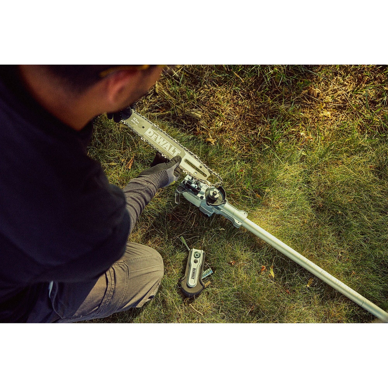 Make hard-to-reach cuts with the 60V MAX* Telescoping Pole Saw. Engineered to meet the needs of the professional arborist, this pole saw features the reach, power and efficiency needed for demanding jobs. With a telescoping shaft that provides a maximum length of 140-in. and a 10-in. bar and chain, users can cut hard-to-reach or high-up branches. Take advantage of cordless performance with peak power up to 75% greater than a 28cc Gas Pole Saw† and a peak torque of up to 64% greater than a 28cc Gas Pole Saw††. This 60V MAX* Telescoping Pole Saw is a part of the DEWALT® 60V MAX* system of tools designed to deliver the power needed for tough jobs (battery and charger sold separately).
