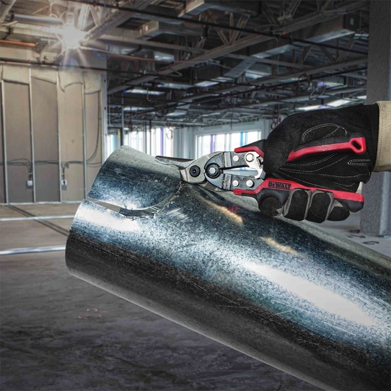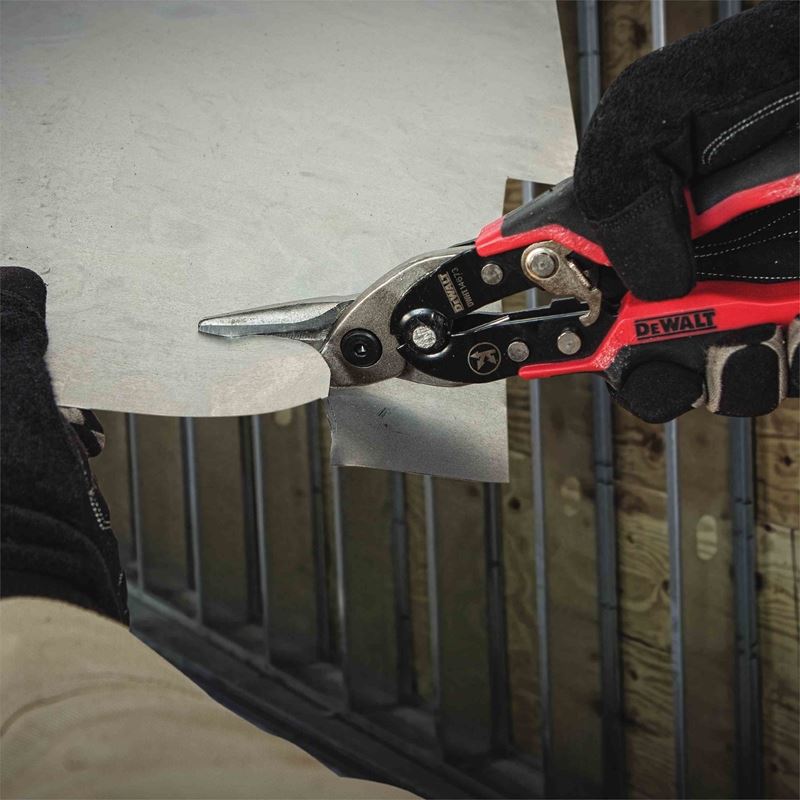 The DEWALT Ergo Aviation snip was designed with a reduced handle span, providing lower level of muscle effort required while cutting tough materials. This tool is traditionally used for cutting aluminum, vinyl siding, screening, cardboard, leather, copper and 18 to 22-Gauge sheet metal. The snip's serrated cutting edge prevent materials from slipping during use and the slip-resistant, bi-material cushion grip ensures a firm, comfortable grip.