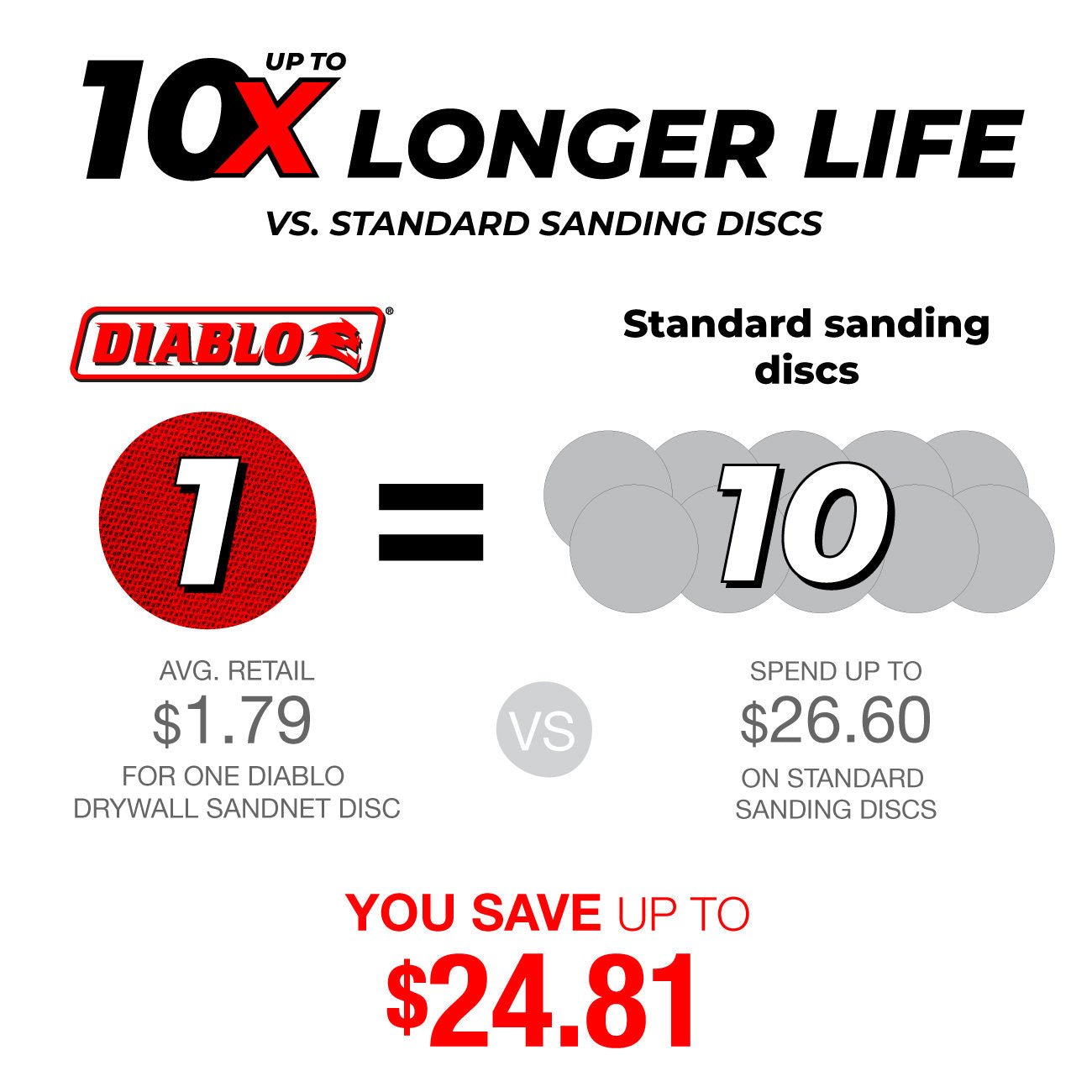 Diablo’s SandNET™ discs for drywall with reusable sanding technology are the most advanced sanding sheets on the market with up to 10X longer life versus standard sanding discs. Each SandNET™ disc features a clog-reducing nylon NET design coated in a premium ceramic blend grit for fast material removal while reducing material build-up. These innovative discs are the premier solution when seeking ultra-smooth finishes when sanding drywall, mud and plaster from medium to large surface areas. The SandNET™ design is easy to clean and reuse multiple times by simply shaking, vacuuming, or rinsing the sheet to remove any pitch build-up.
