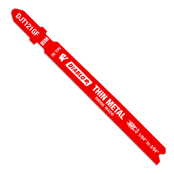 Diablo’s bi-metal teeth jig saw blades are specifically designed for maximum durability, longer life and speed in thin metal applications ranging from 1/64” to 3/64” thickness. These high-performance blades feature an ultra-hardened cutting edge to deliver up to 5X longer life than standard blades. A back taper blade design and Perma-SHIELD® non-stick coating reduces heat and pitch build up for fast and clean cuts in metal. T-shank design fits all combo and most U-shank cordless and corded jig saws.