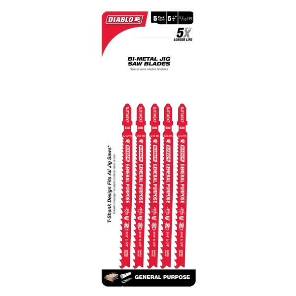 DIABLO DJT345XF5 5-1/4" 5/10TPI Bi-Metal Jig Saw Blades for General Purpose Cuts (5-pk)