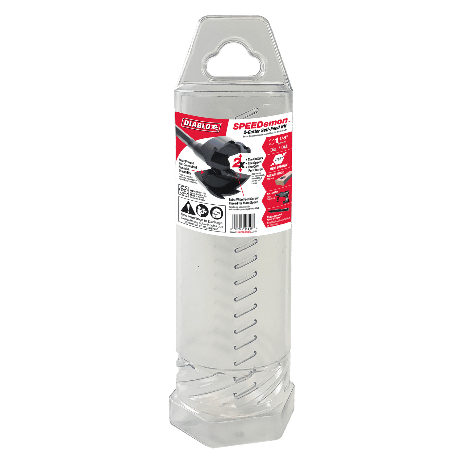 Diablo’s new SPEEDemon™ 2-cutter Self-Feed Bits are designed to strict tolerances in the heat forging manufacturing process resulting in energy efficient drilling with up to 2X life per battery charge. Diablo Self-Feed Bits 2-cutter design and an aggressive low thread count feed screw deliver up to 2X more holes per charge. The replaceable feed screw features a pull out stop mechanism that prevents the screw from slipping out when the bit is removed from the material. The combined innovative engineering of Diablo Self-Feed Bits make them the ideal choice for making holes up to 2X faster in soft woods.