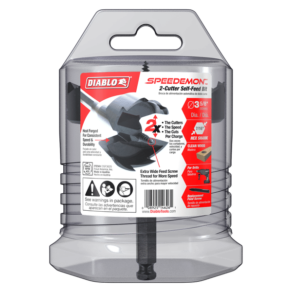 Diablo’s new SPEEDemon™ 2-Cutter Self-Feed Bits are designed to strict tolerances in the heat forging manufacturing process resulting in energy efficient drilling with up to 2X life per battery charge. Diablo Self-Feed Bits 2-cutter design and an aggressive low thread count feed screw deliver up to 2X more holes per charge. The replaceable feed screw features a pull out stop mechanism that prevents the screw from slipping out when the bit is removed from the material. The combined innovative engineering of Diablo Self-Feed Bits make them the ideal choice for making holes up to 2X faster in soft woods.