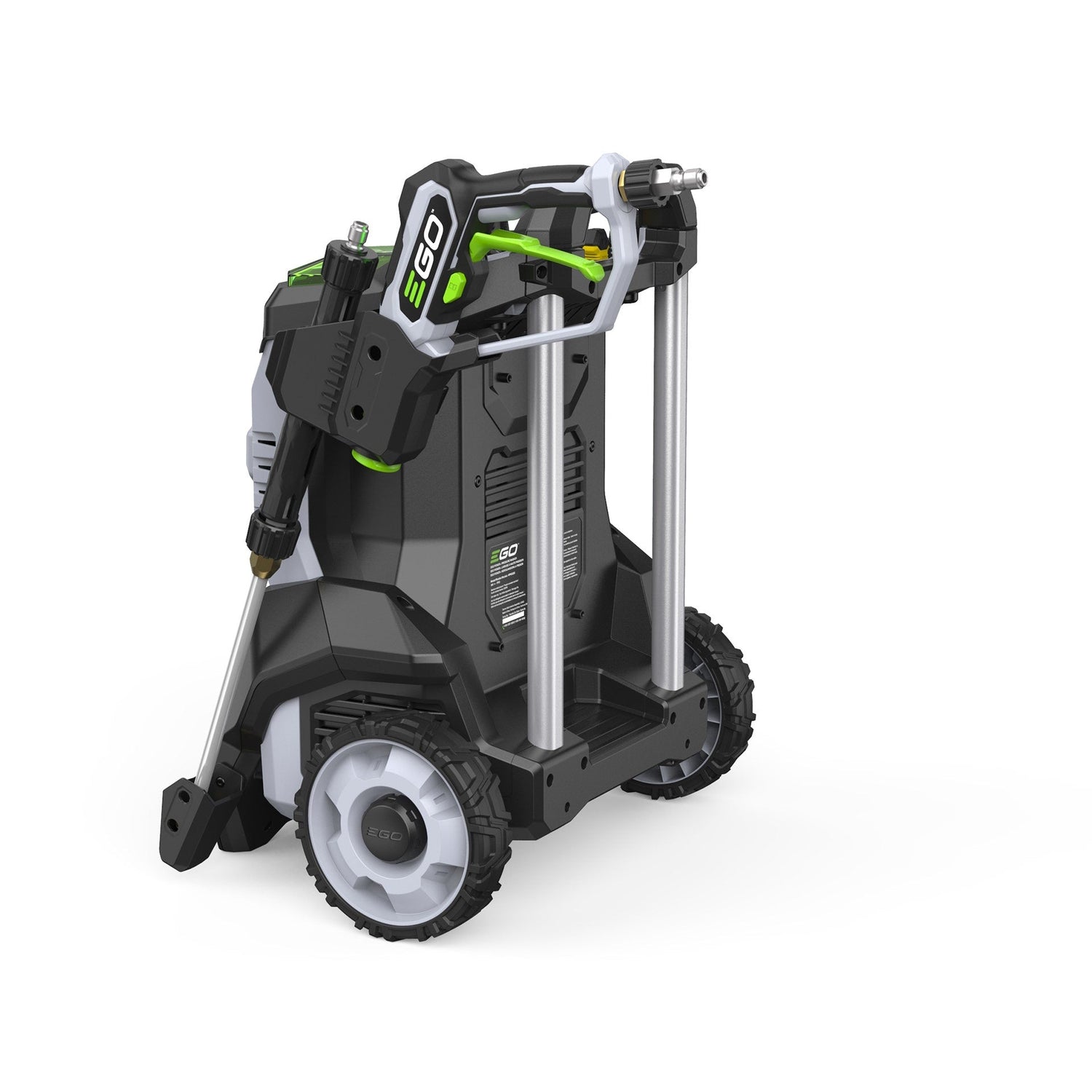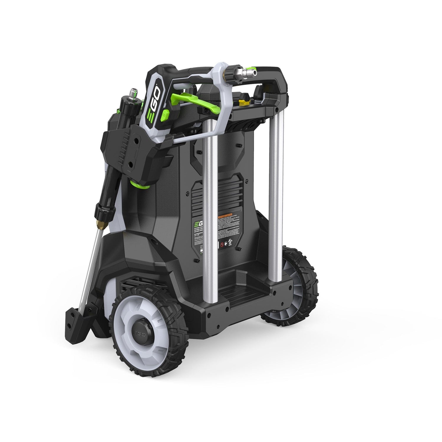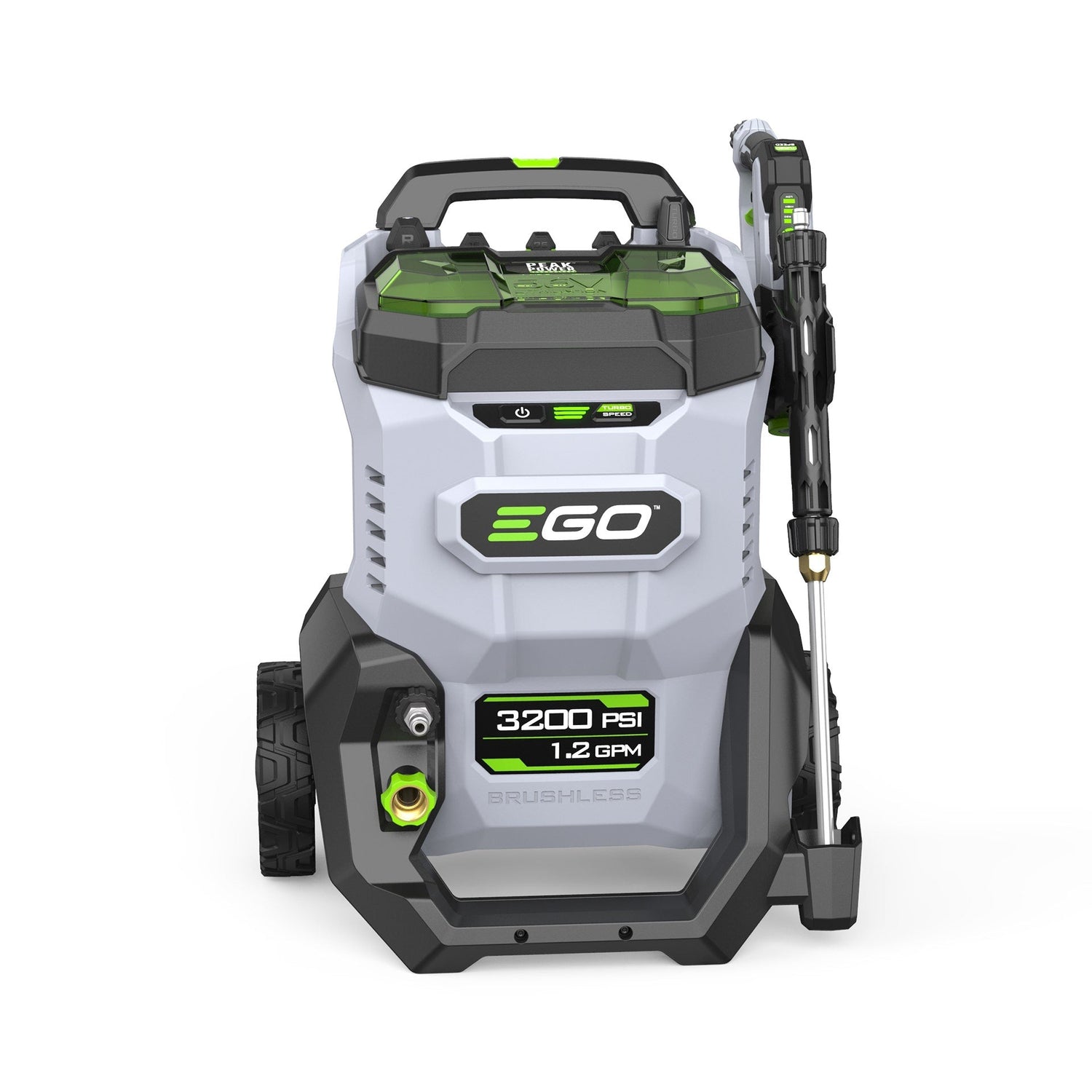 The EGO POWER+ 3200 PSI Pressure Washer is the industry’s most powerful cordless pressure washer*. Featuring Peak Power™ technology, this cordless electric pressure washer combines the power of any two EGO POWER+ 56V ARC Lithium™ batteries to deliver up to 3200 PSI at 1.2 GPM—and up to 2.0 GPM max—for powerful and efficient cleaning. It delivers up to 60 minutes of runtime on a single charge with two included 6.0Ah ARC Lithium™ batteries. Handheld pressure control allows you to select ECO, High, and Turbo modes as well as view battery charge status via the display integrated into the wand. Quick-connection points for hoses and the wand allow easy setup, breakdown, and nozzle changes. A telescopic handle pulls out for easy transport and collapses for compact storage. The power washer comes with a flexible 25-foot high-pressure hose, siphon hose, 15-degree nozzle, 25-degree nozzle, 40-degree nozzle, turbo nozzle, rinse nozzle, quick-connect short pressure washer gun, quick-connect wand lance, stainless steel wand, foam cannon, and filter. The portable pressure washer can draw from a fresh water source like a bucket when used with the included siphon hose. Clean with Power Beyond Belief™ with the EGO POWER+ 3200 PSI Pressure Washer. *Based on 2023 Chervon testing on Turbo mode
