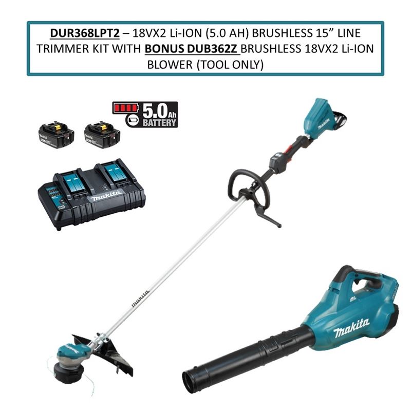Makita DUR368LPT2 18VX2 (36V) Li-Ion (5.0 Ah) Brushless 15 in Line Trimmer Kit with Bonus DUB362Z (18VX2) Turbo Brushless Blower (Tool Only)