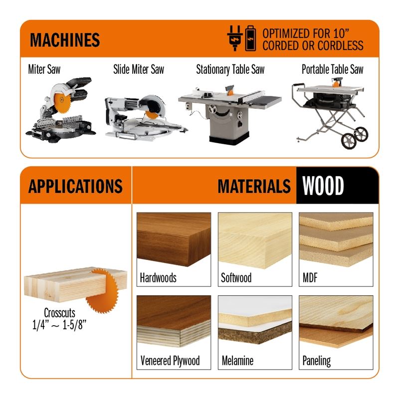Optimized for 10 in corded or cordless miter saws/ sliding miter saws, stationary table saws and portable table saws.