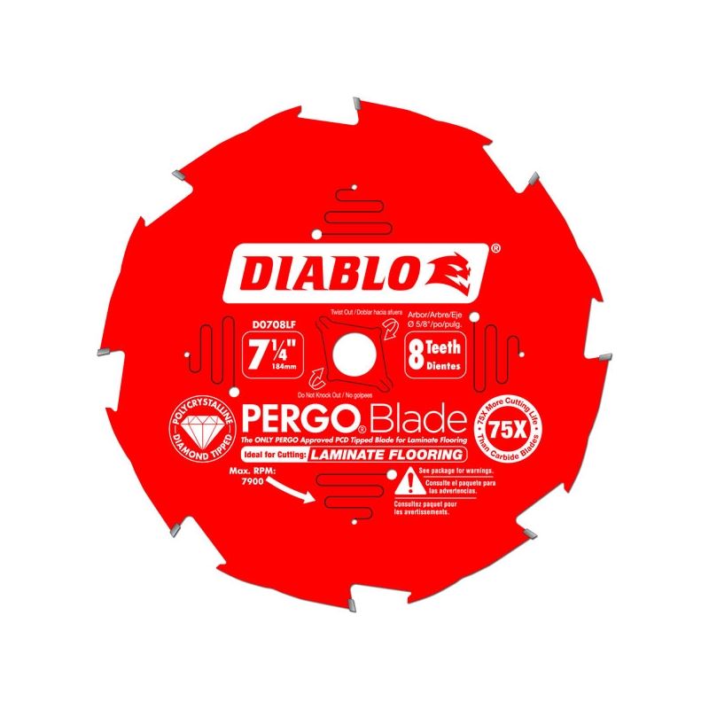 Diablos New 7-1/4 PCD Tooth PergoBlades are the first blades specifically designed for cutting laminate flooring in a chop saw application. This radical new design delivers 75 times the cutting performance compared to a carbide-tipped saw blade. This blade is the only approved blade by the Pergo brand for cutting their material. D0708LF