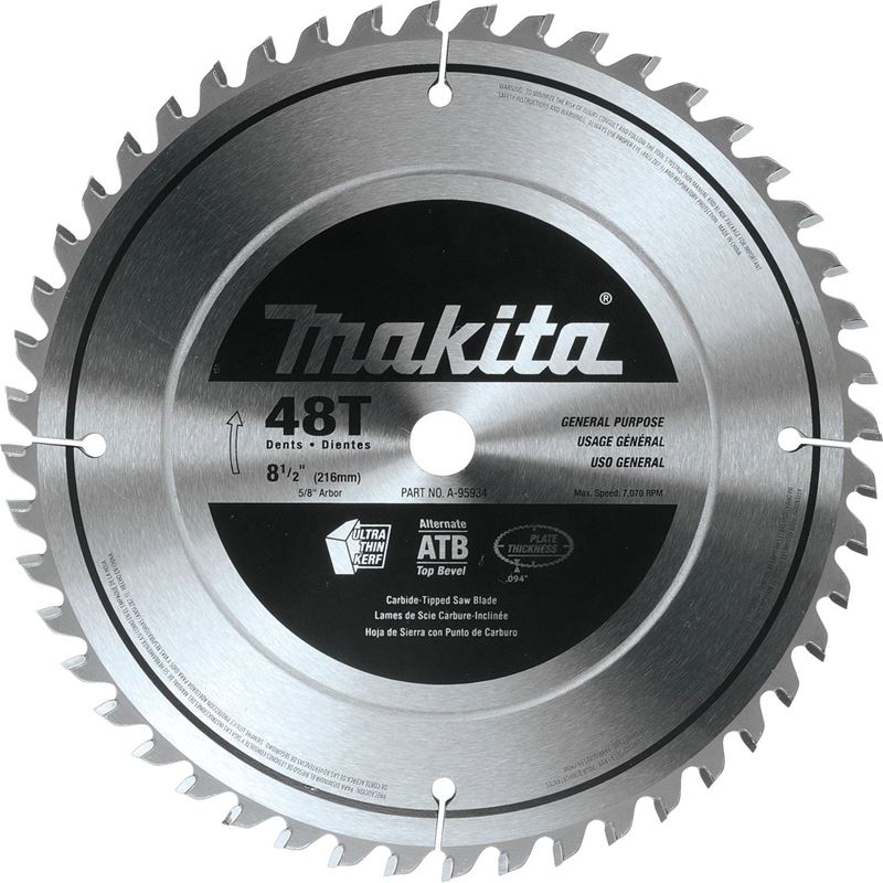 The Makita A-95934 8-1/2in 48T TCT Miter Saw Blade is engineered to work with most 8-1/2in Miter Saws for precision cutting. The steel plate on each blade is expertly tensioned and fully hardened for true cuts throughout the life of the blade. The 48 tooth design makes this a good general purpose blade that works well in many common applications.