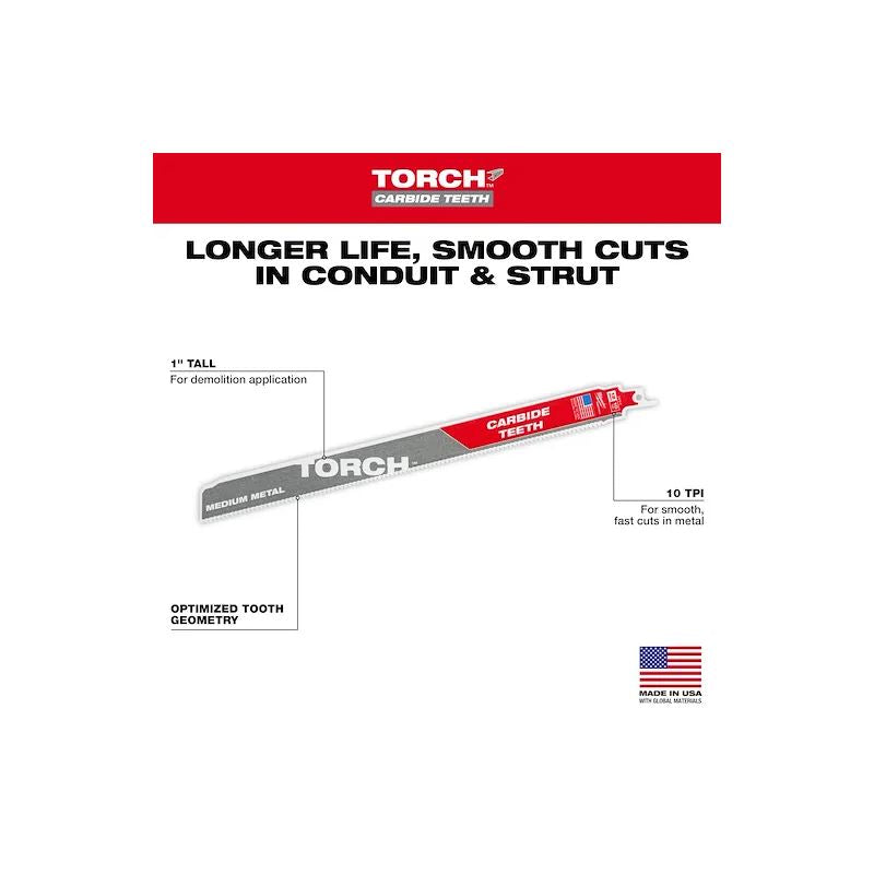 The TORCH™ with Carbide Teeth for Medium Metal cuts longer, cuts more, cuts faster. This blade is designed with Carbide Teeth for longer life vs. bi-metal blades in EMTconduit, Strut, Rigid Conduit, StainlessSteel Pipe, Stainless Steel Strut, andCopper. This 10TPI blade is ideal for smooth, fast cuts and enhanced durability.