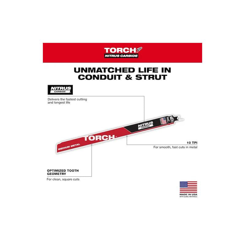 The TORCH™ with NITRUS CARBIDE™ for Conduit, Strut, and other medium-thickness metals delivers the fastest cutting, and longest life with a breakthrough Carbide Technology. Our NITRUS CARBIDE™ blades are engineered to dissipate heat better than any other demolition blade for faster cutting?. The TORCH™ with NITRUS CARBIDE™ for Medium metals delivers 2x life versus carbide teeth blades in rigid metal conduit. This 10TPI blade is ideal for smooth, fast cuts and enhanced durability in conduit, strut, angle iron, and Stainless Steel.