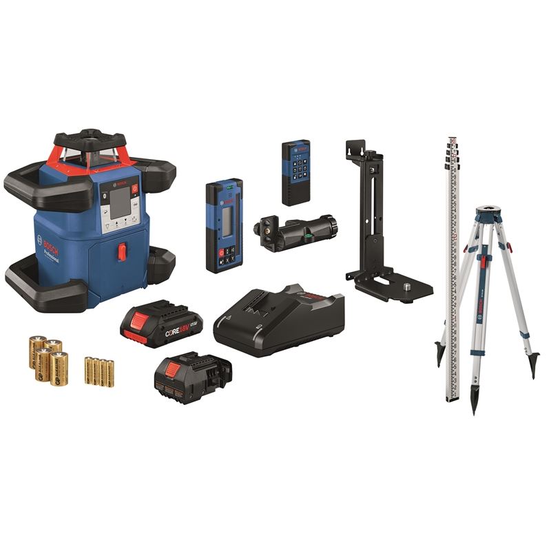 The Bosch REVOLVE4000 GRL4000-80CHVK rotary laser kit comes with an LR40 laser receiver with bracket, CORE18V 4.0 Ah Compact Battery, 18V battery charger, alkaline battery adapter, four D batteries, four AA batteries, BT170 tripod, grade rod, wall mount, RC5 remote control and carrying case.
