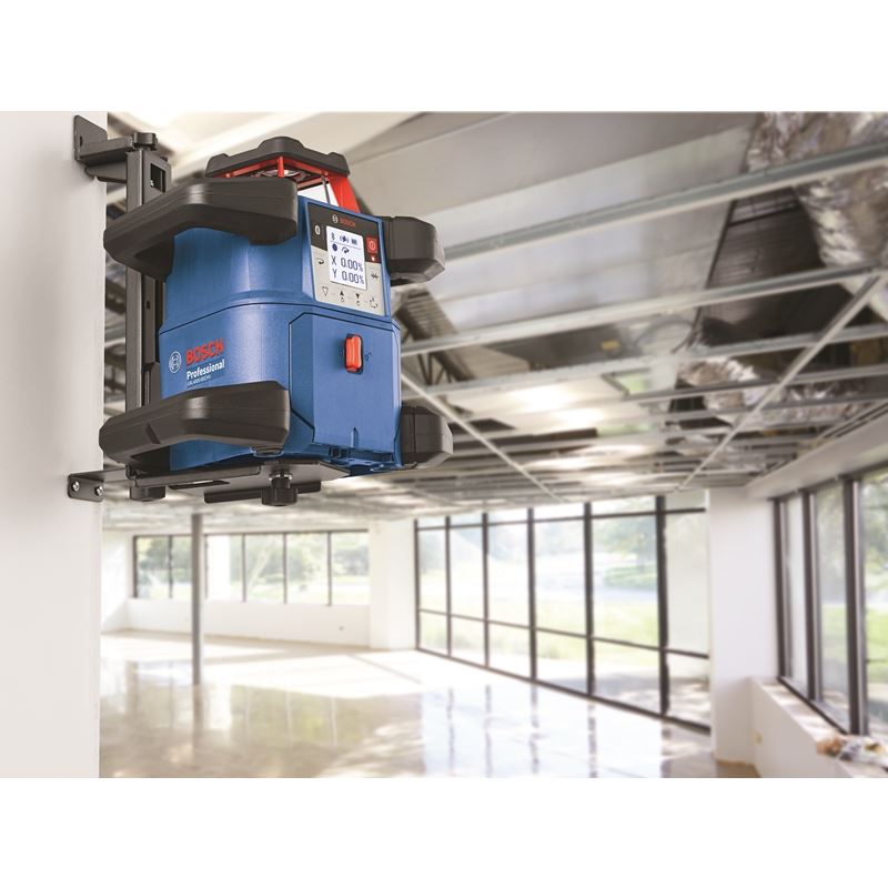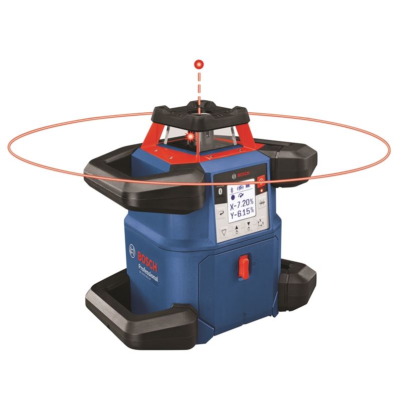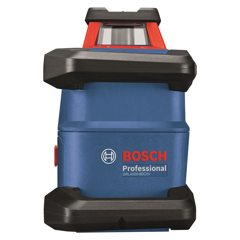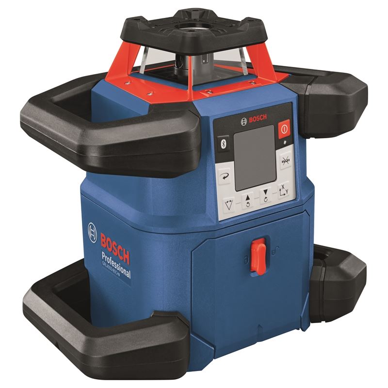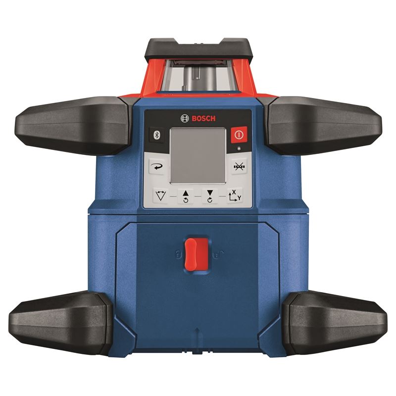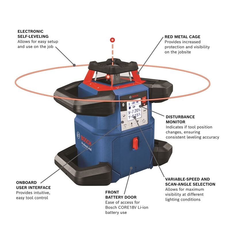 |The Bosch 18V REVOLVE4000 Connected Self-Leveling Horizontal/Vertical Rotary Laser Kit has it all, with Dual Dial-In Slope, CORE18V Li-ion power, Bluetooth ® connectivity, user-calibration, and more. The Dual Dial-In Slope feature allows the user to adjust the slope angle on the laser on both the X and Y-axes. Powered by a Bosch CORE18V battery, providing extended runtime, the rotary laser has a cage overmold, an innovative handle design and is built to IP68 standards. The GRL4000-80CH laser has Bluetooth ® connectivity, uCAL user-calibration, an accuracy of up to ±1/16 In. at 100 Ft. in horizontal applications, and a range of up to 4,000 Ft. with the LR40 laser receiver. The laser features a vertical beam at 90 ° point for layout, squaring and plumb applications. The comprehensive kit includes a remote control, CORE18V 4.0 Ah battery and charger, alkaline battery adapter, wall mount, laser receiver, tripod, grade rod and robust carrying case.