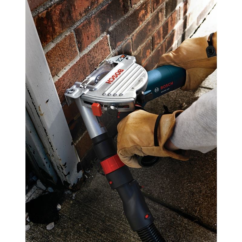 The Bosch AG50-10TG 5 In. angle grinder with slide switch and new tuckpointing guard with tool-less installation, makes it quick and easy to install and remove. The variable depth adjustment allows the guard to collect dust throughout the duration of the cut, from the initial plunge until the blade is removed from the material. The large viewing window makes it easy to see the line of cut when in operation. The dust extraction port ensures a cleaner work piece and job site when used with a vacuum., The AG50-10TG features a 10 Amp motor design with direct motor cooling and more air vents. This feature reduces hand blockage to extend tool life and provide higher overload capabilities to prevent overheating. Results from independent testing revealed that Bosch grinders outlast the competition to deliver the best tool lifetime in the market- up to nine times more life than competitors. Improved carbon brushes offer more than double the lifetime of previous brushes, which means less downtime for maintenance. Additional features include textured housing to provide increased grip options for better ergonomics and tool control.